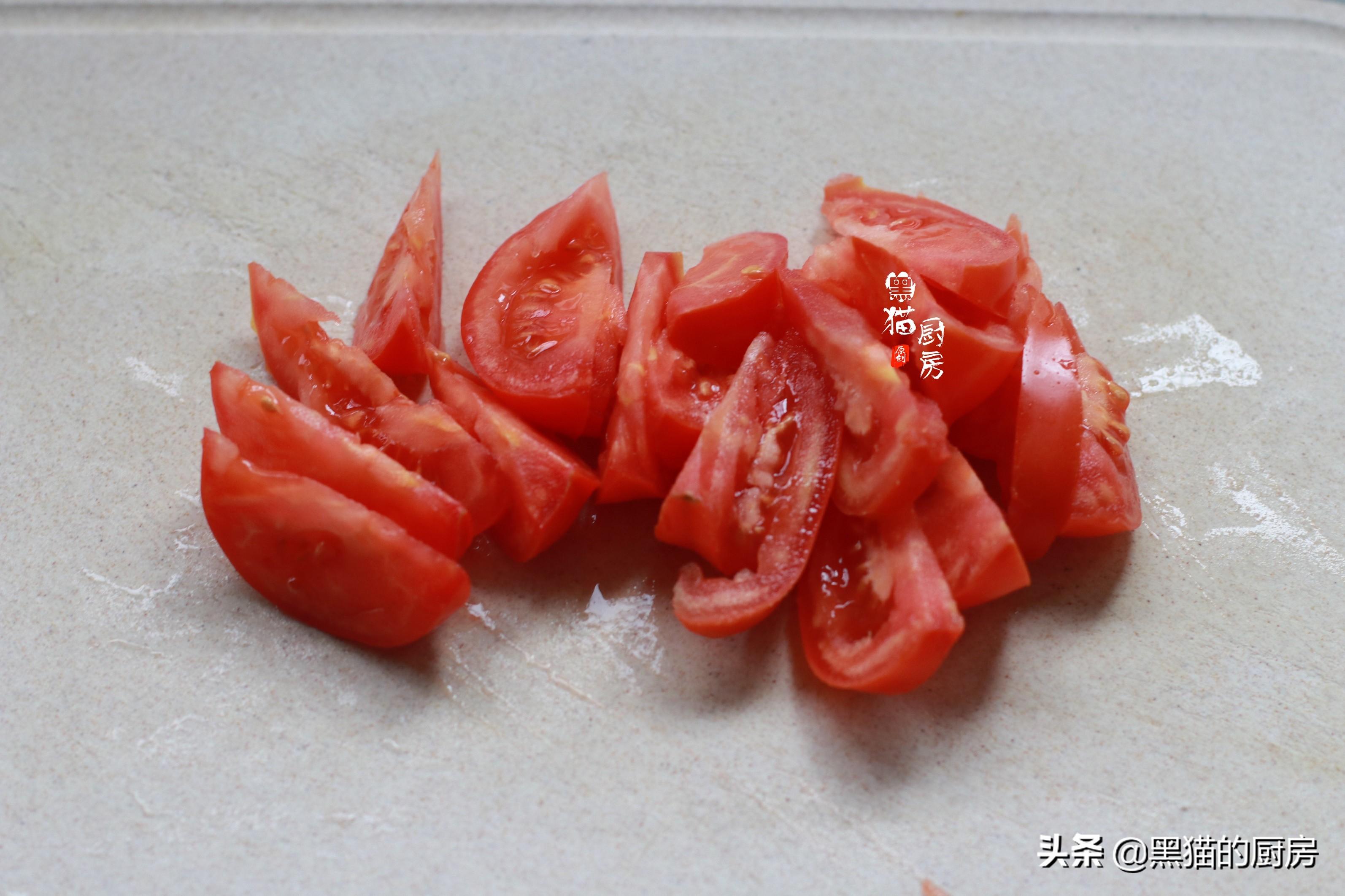 2.西红柿可用热水烫去外皮,但是我比较喜欢带皮的西红柿,洗洗干净直接切开,简单省事。