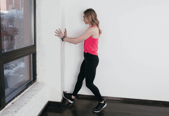 动作很简单,首先是找一面墙,距离墙一米左右的地方站好,双手扶住墙,脸部朝地面,双腿分开与肩同宽,双腿呈弓步前后摆好姿势,在前面的腿的膝盖和后面那条腿保持在一条直线上,身体向下振动,感觉自己后面那条腿的小腿后部肌肉被拉伸时,保持姿势20秒,然后换腿继续。