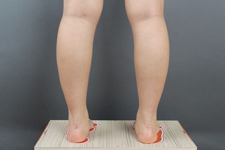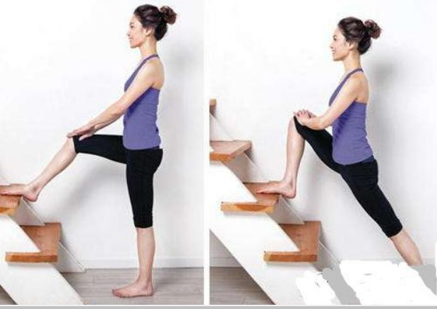找一个20-30厘米高的台阶或者凳子,左脚放上去,前半脚掌贴紧台阶面,后半脚掌悬空,身体保持直立,左脚用劲蹬地,像爬楼梯时一样,悬空的脚掌向下压,此时小腿后部肌肉会有拉伸感,不断重复。