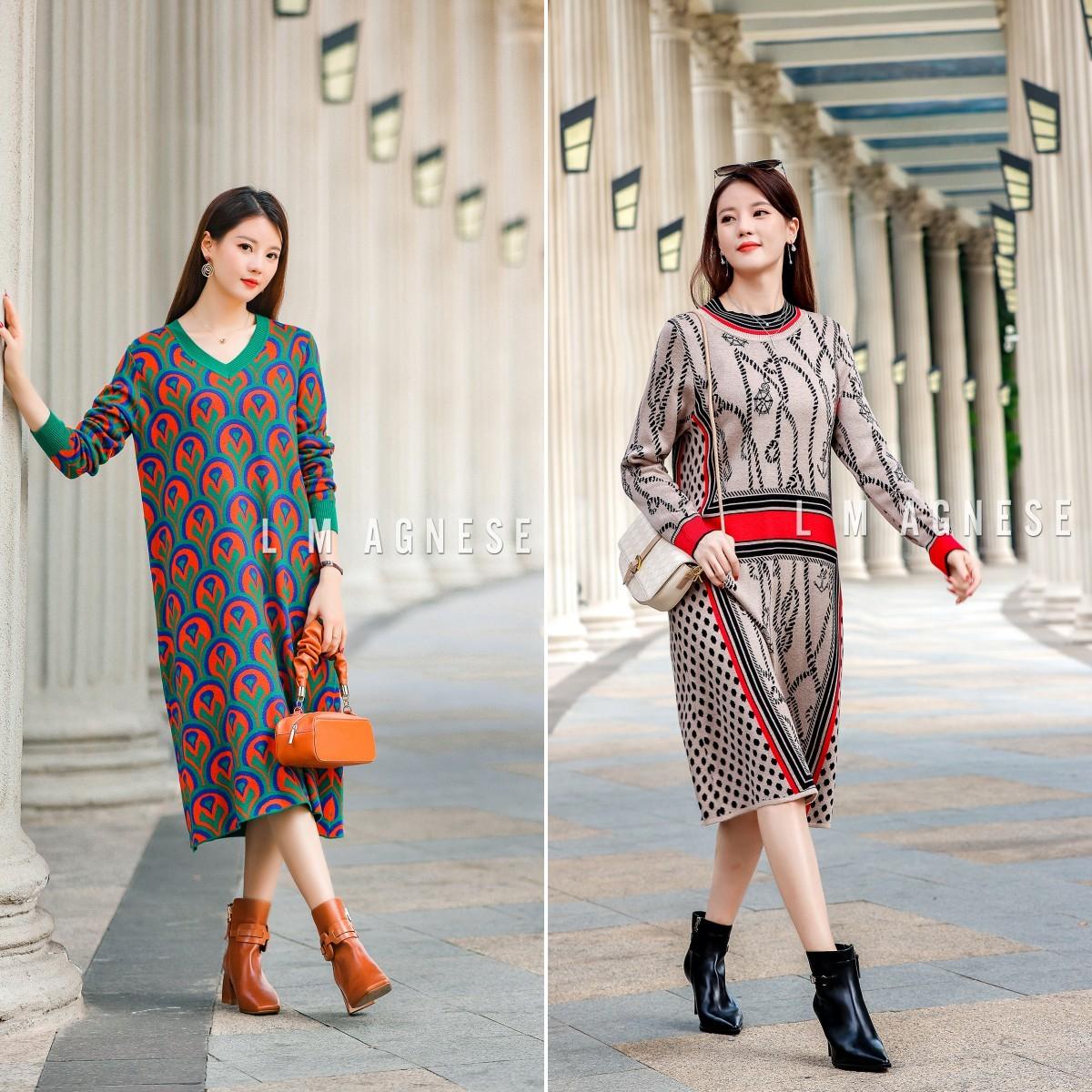 旭日暖冬,简爱格妮斯L M AGNESE采用清新亮眼的撞色几何纹理,打造生机勃勃的冬日感;运用印满烂漫元素的印花,是对外界永葆好奇与探索。这款针织长裙在不同的光线下呈现不同的光泽流动感,宛如倾听泰晤士河畔经典优雅的曲调。搭配一双牛皮高跟靴,尽显摩登风尚。