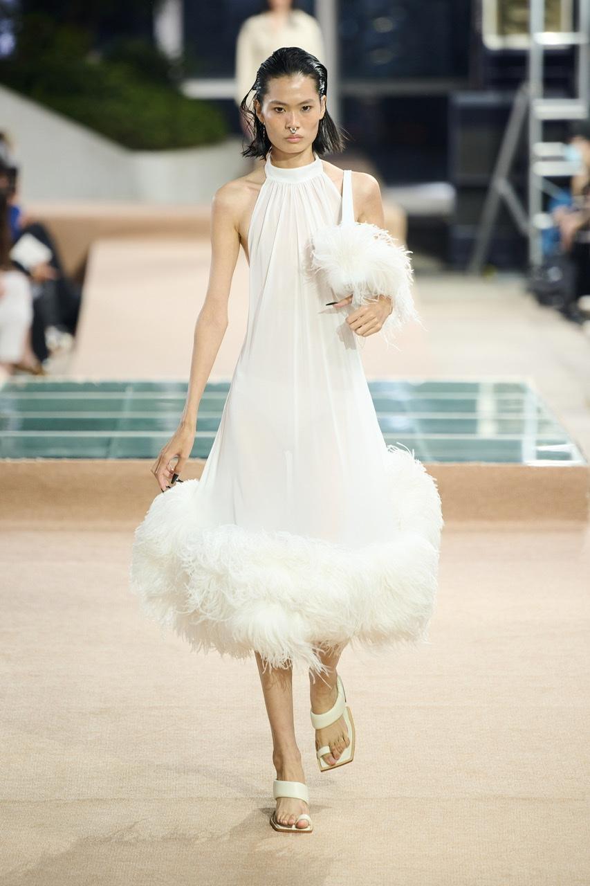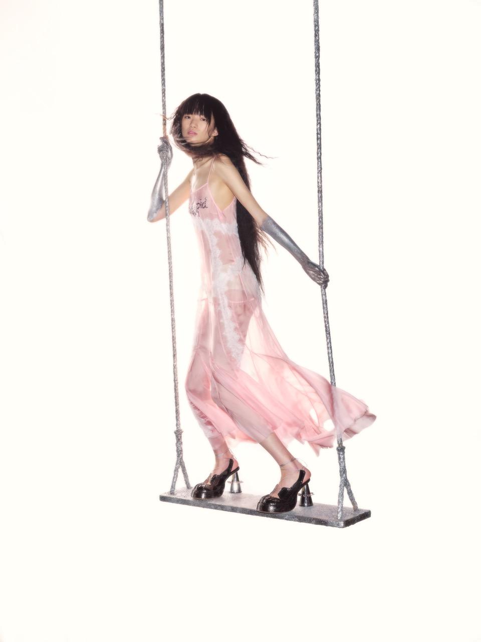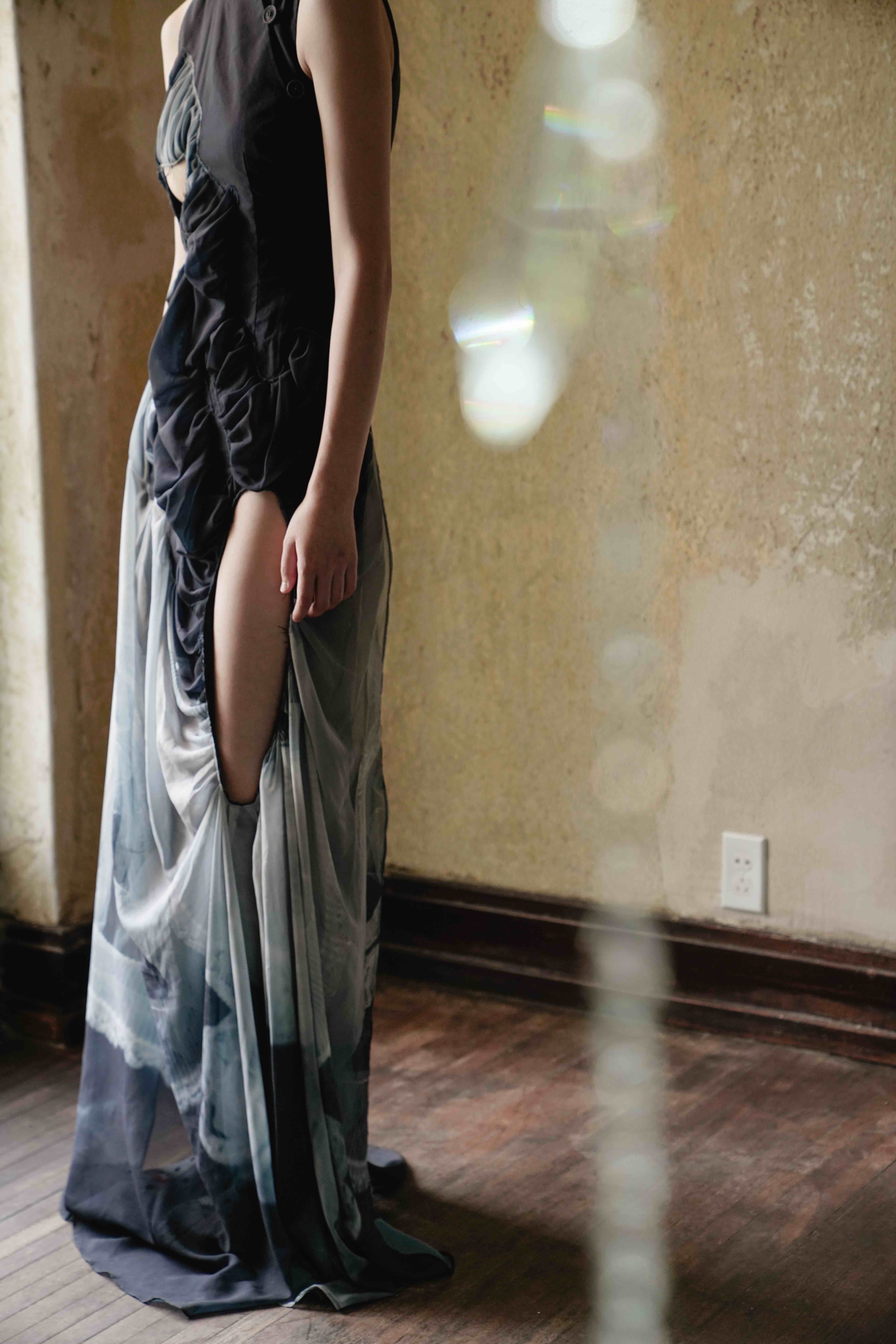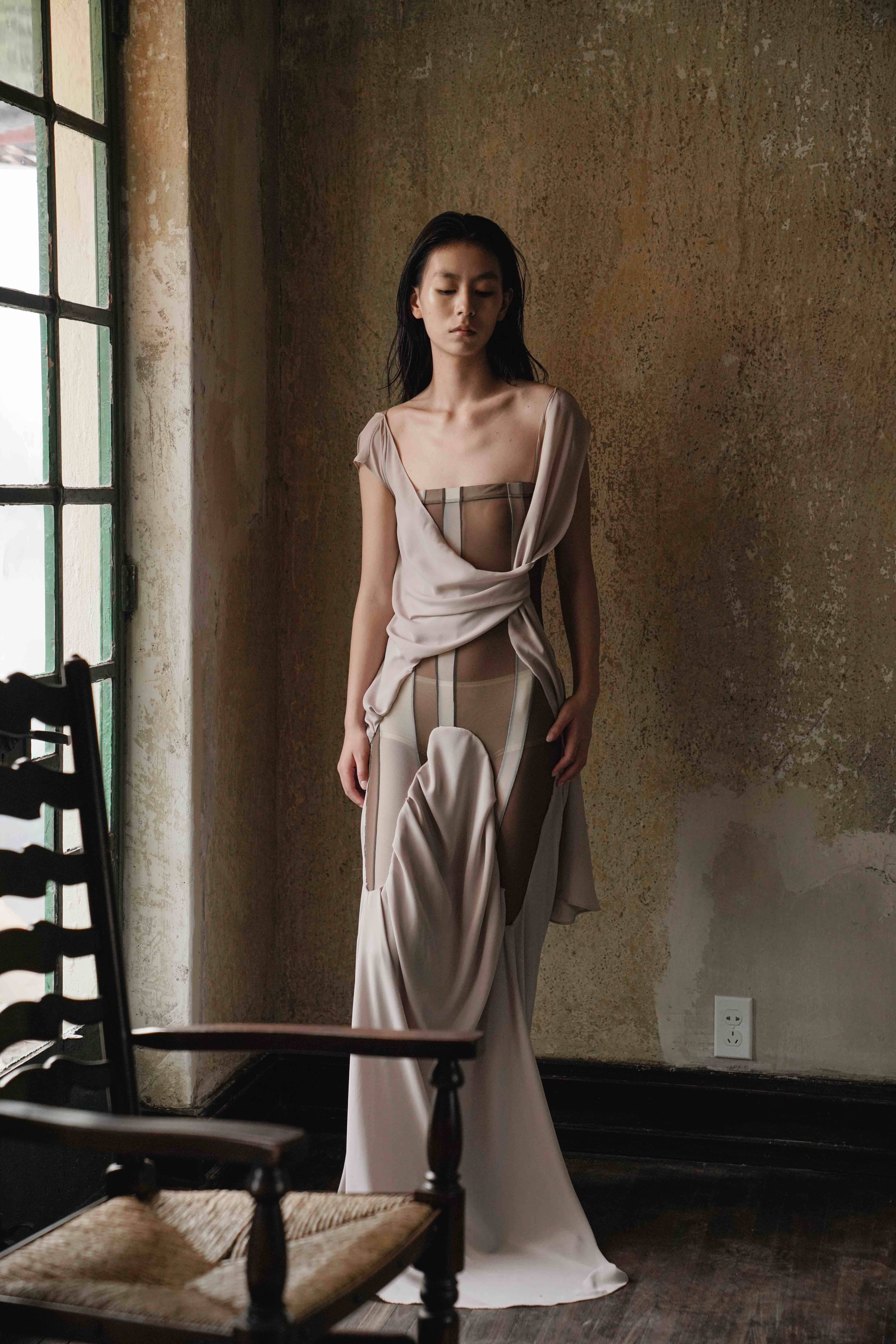 在上海2023春夏时装周上,Sieriz发布了其系列作品——2023春夏系列。本季的设计重点是通过不同的材质与重力感相交织,让服装在穿者身上呈现沉重与轻盈的冲撞感。在设计中,这位设计师大量采用了轻盈面料的褶皱设计和镂空处理,对传统的女装廓形进行一定程度的破坏和颠覆,回应“沉浮”的设计主题。