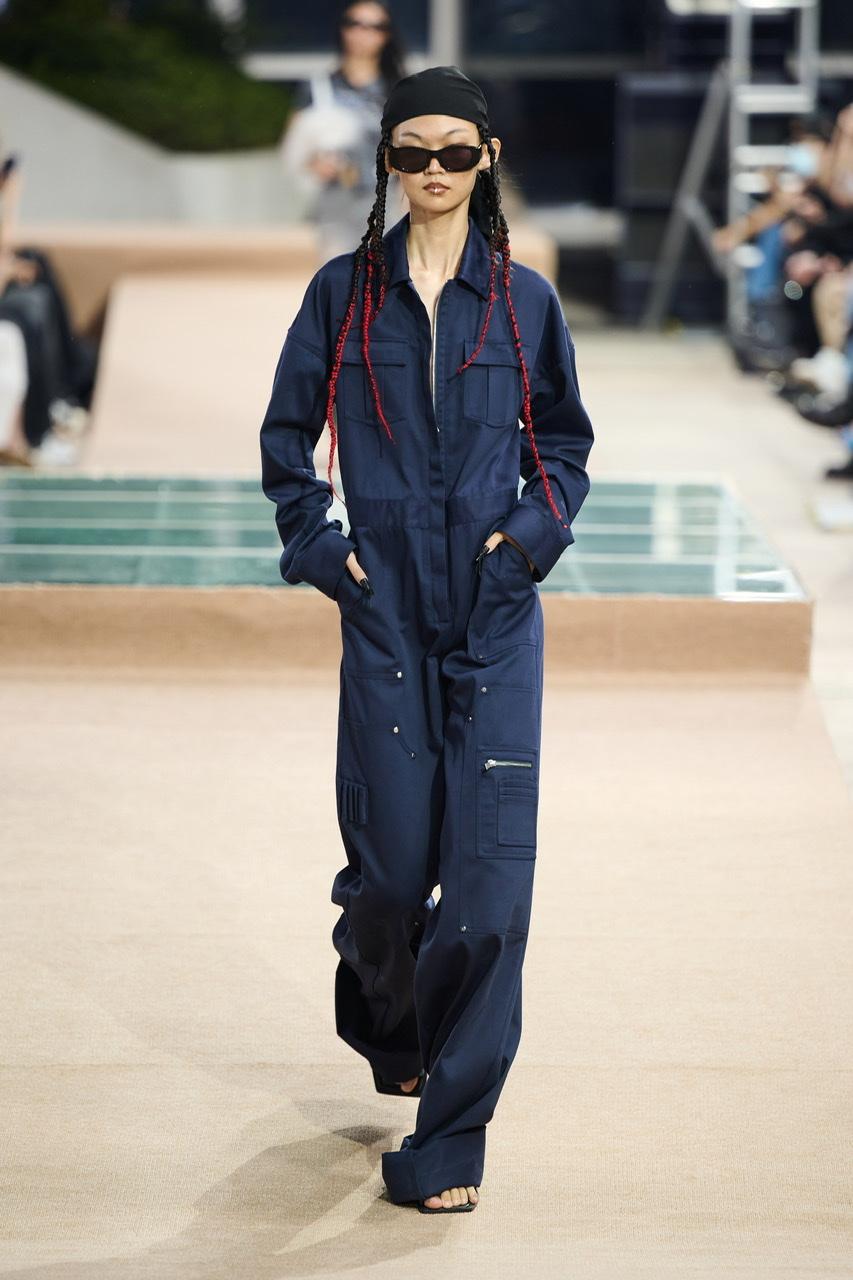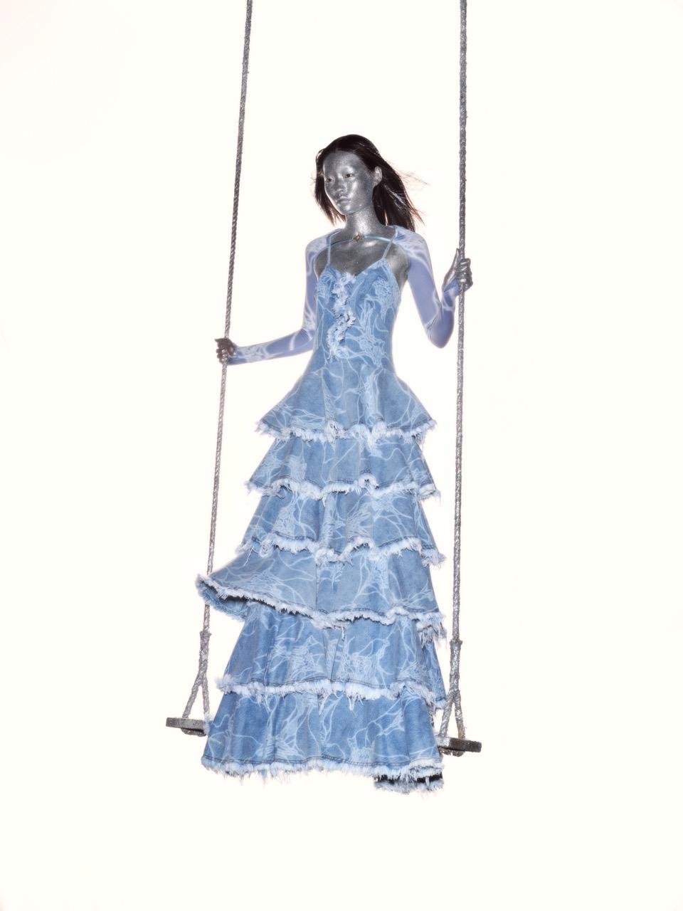 而被称为“释怀”的第二部分,则一改粉红的纯真与热烈,而是以不同深浅的蓝色作为主色调,大面积采用牛仔丹宁和衔接了类似的水洗毛边,呈现撕裂之感。