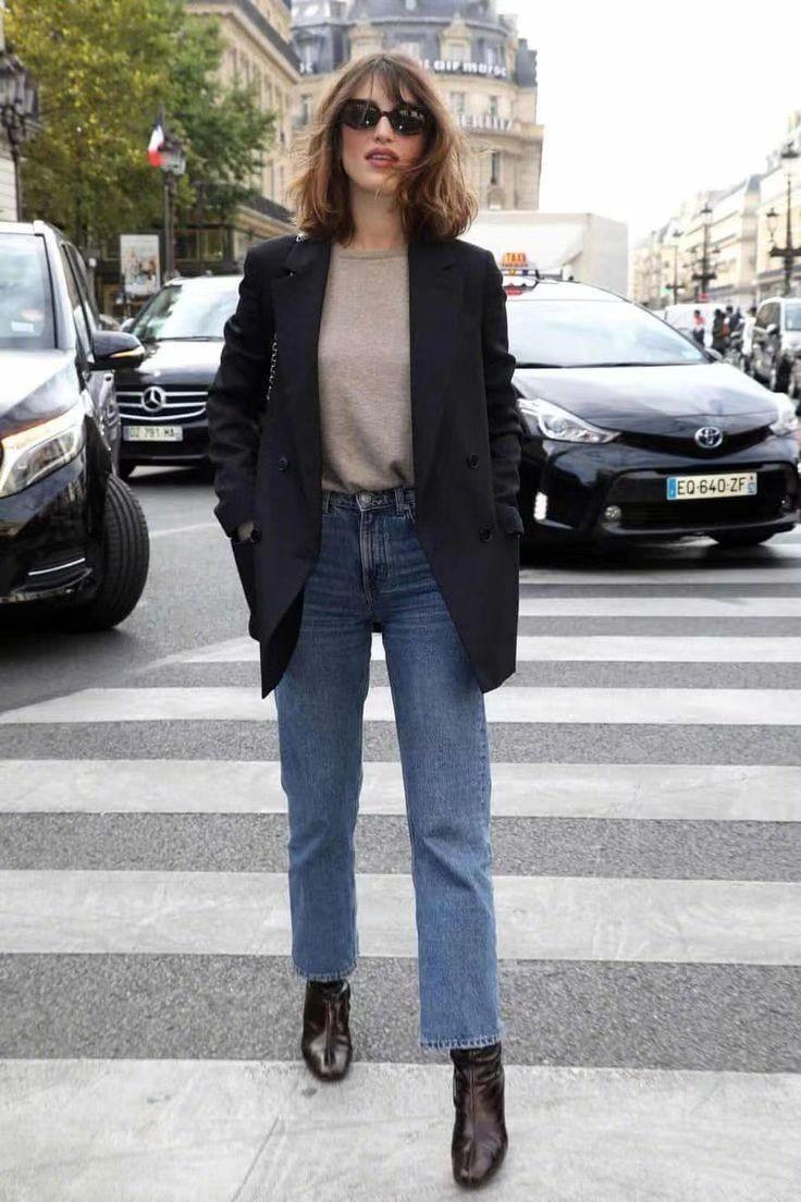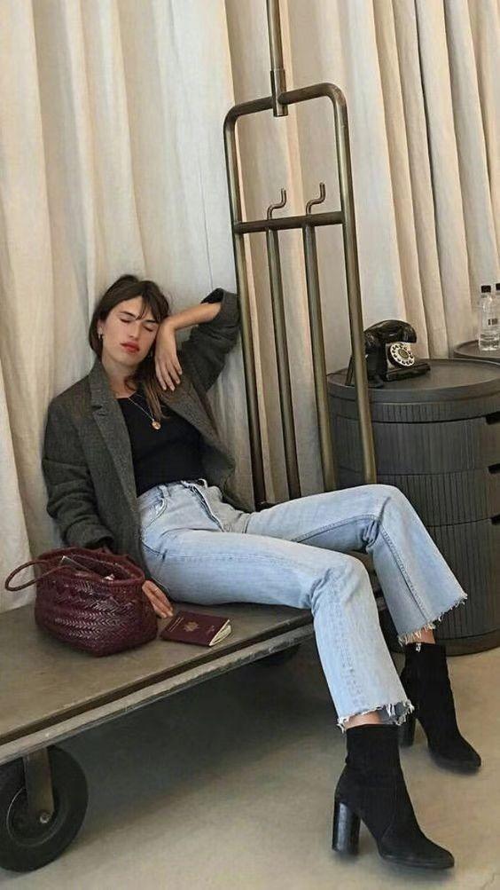 在职业风格的西服搭配当中,我们也可以选择高收腰设计的内搭来凸显大长腿,复古风格的灰色呢子西服里面搭配上轻薄的黑色打底以及浅蓝色牛仔九分裤,利用深浅颜色对比分割腰线,脚踩恨天高短靴,也十分前卫个性。
