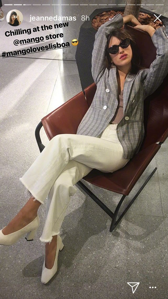 灰色格纹西服搭配上高腰小白裤,搭配起来显得呆板又老气,有了墨镜加持,顿时酷帅又带感。