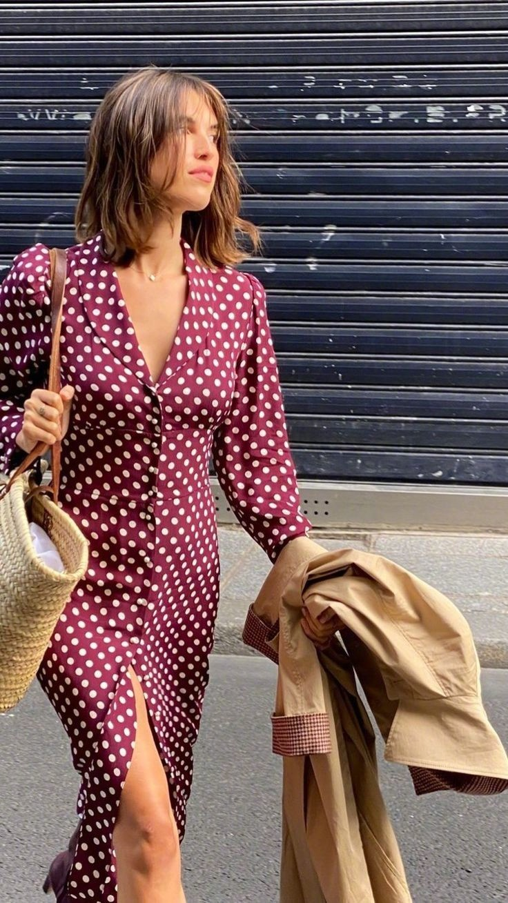 有时候,适当的展现曲线美可以增强女性妩媚动人的魅力,相比于大面积露肤,这种适当露肤反而显得高级大气,这款酒红色波点衬衫连衣裙,采用深V结合高开叉裙摆,上下呼应,同时又微微露出颈部肌肤以及腿部肌肤,女人味爆棚。