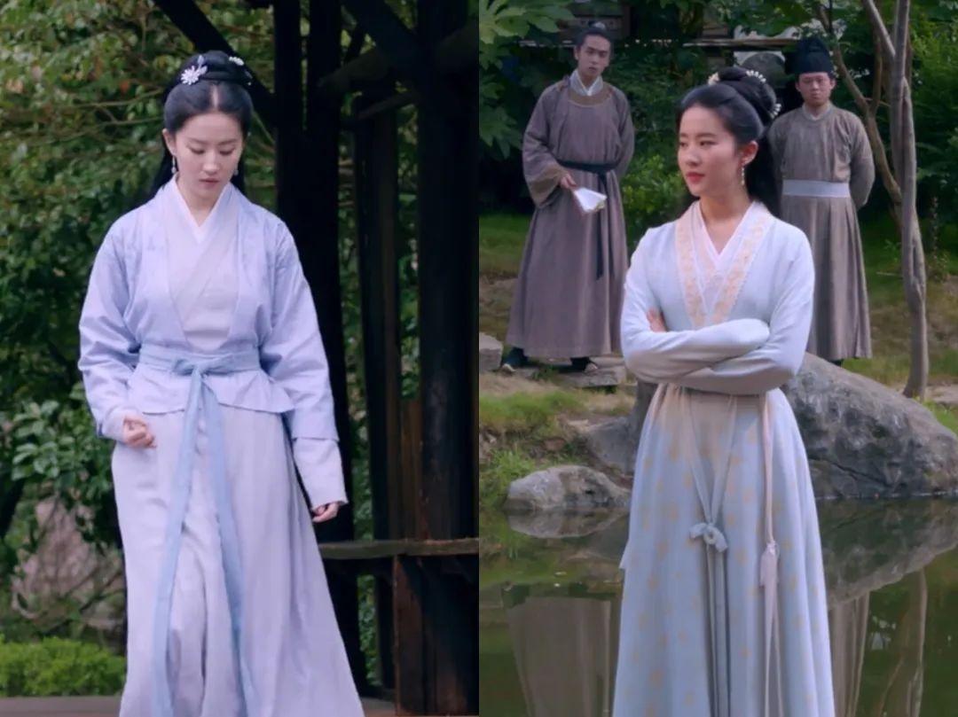 淡雅的浅紫、浅蓝也是盼儿常穿的颜色,而且基本上是对襟窄袖衣、交领裙装等宋朝民间流行的式样。她作为小富婆一枚,穿衣自然是精致时髦一些的。