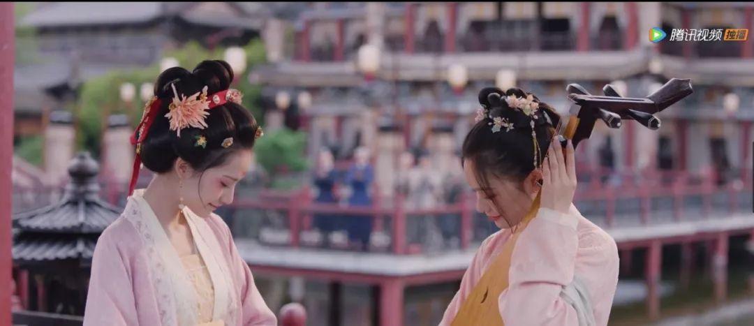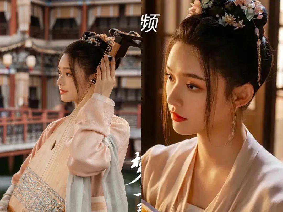 发型和发饰也都比较活泼娇俏。精巧的发髻搭配各种花花绿绿的簪花,既符合她的年纪,也符合她沉浸于自己的琵琶世界、不谙世事的人设。