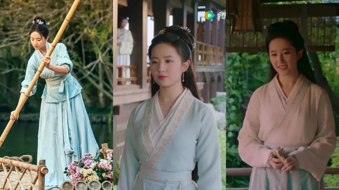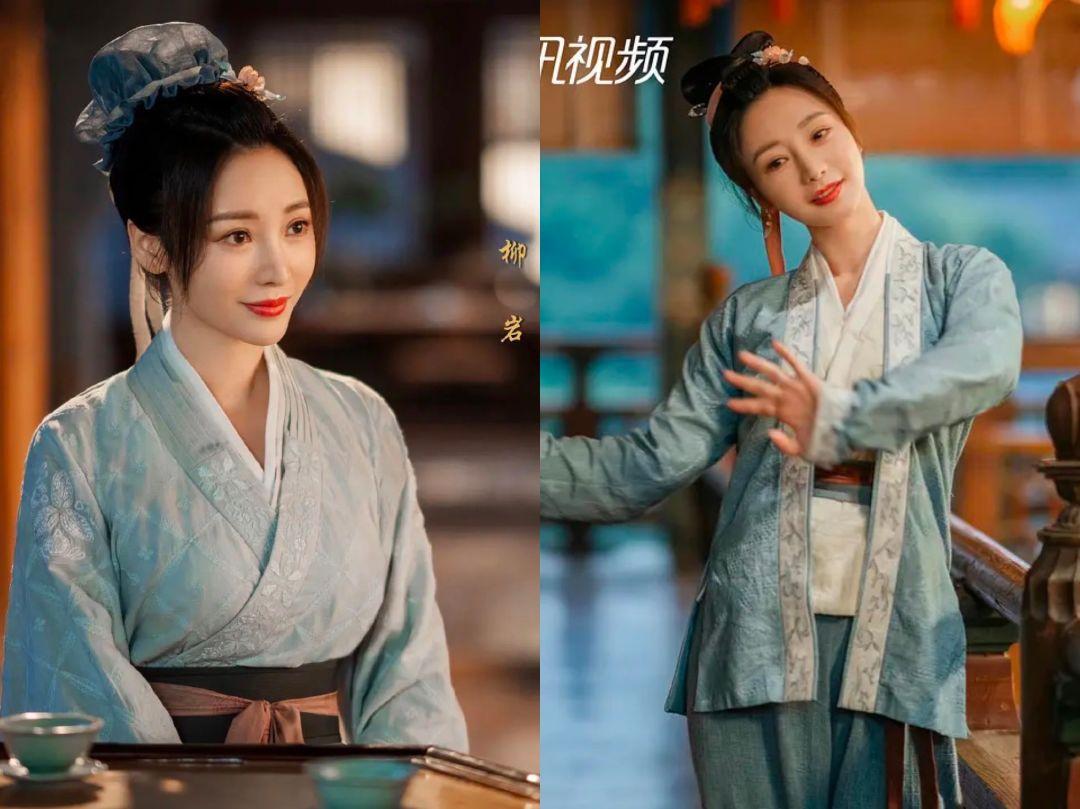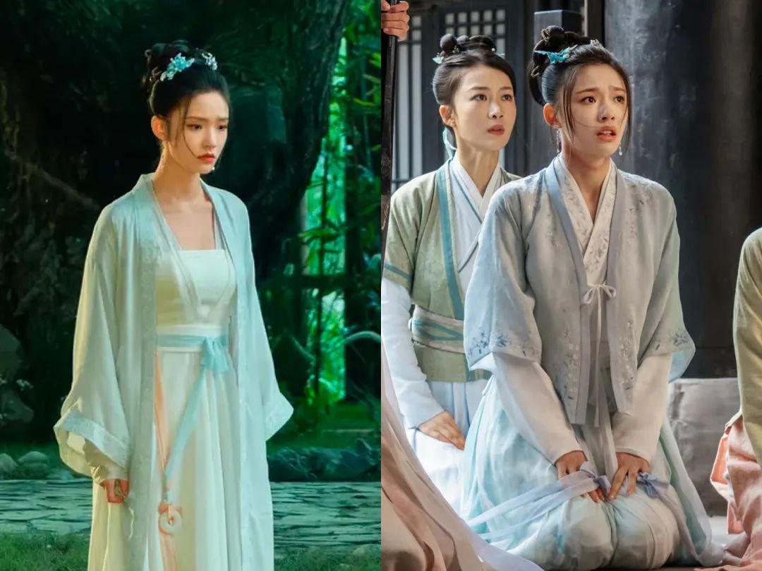 前期剧中赵盼儿的服饰就如同烟雨江南景色般,多以素净的青色、白色或是青白搭配为主,温婉简约。