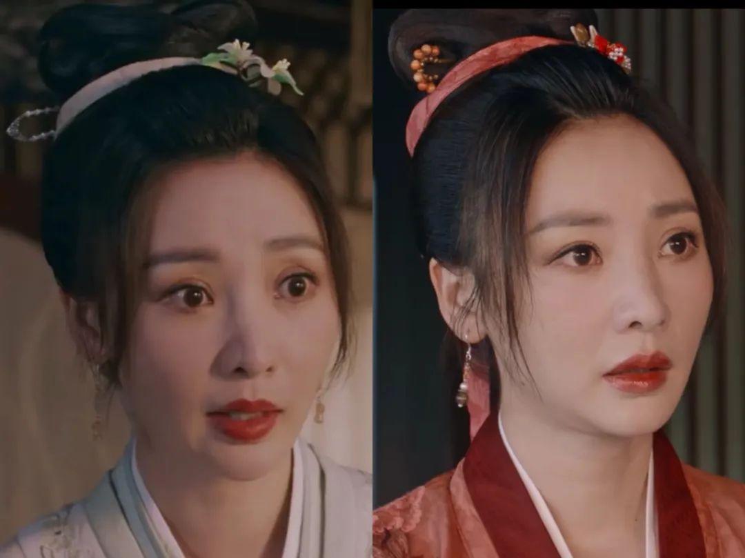 因为饰演的角色年纪较大,她的妆容较浓,尤其是唇妆,常常是较浓郁的枫叶色,头上还束了发带,比较符合她成熟妇人的人设。