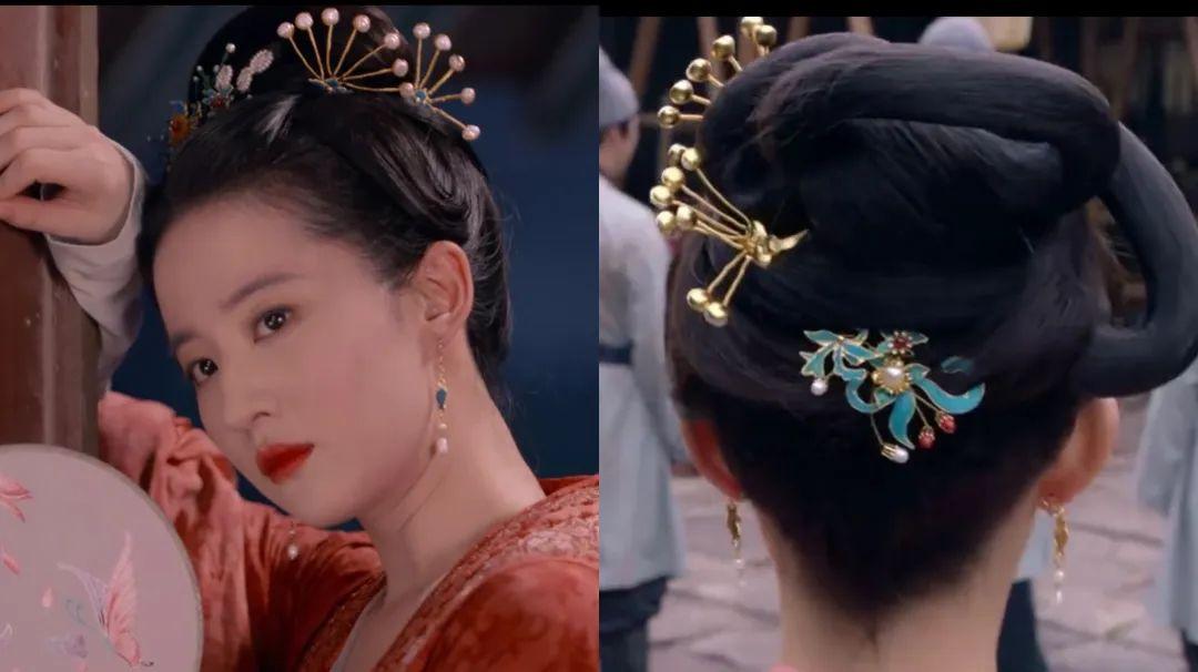 盼儿的披发造型多,亮点就是各种配饰,无论是头上的簪花、簪、钗等,还是耳环,都与衣服色系相协调。