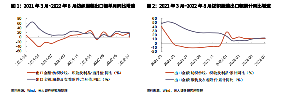 1、2022年8月纺织品、服装出口额分别同比-0.3%、+5%