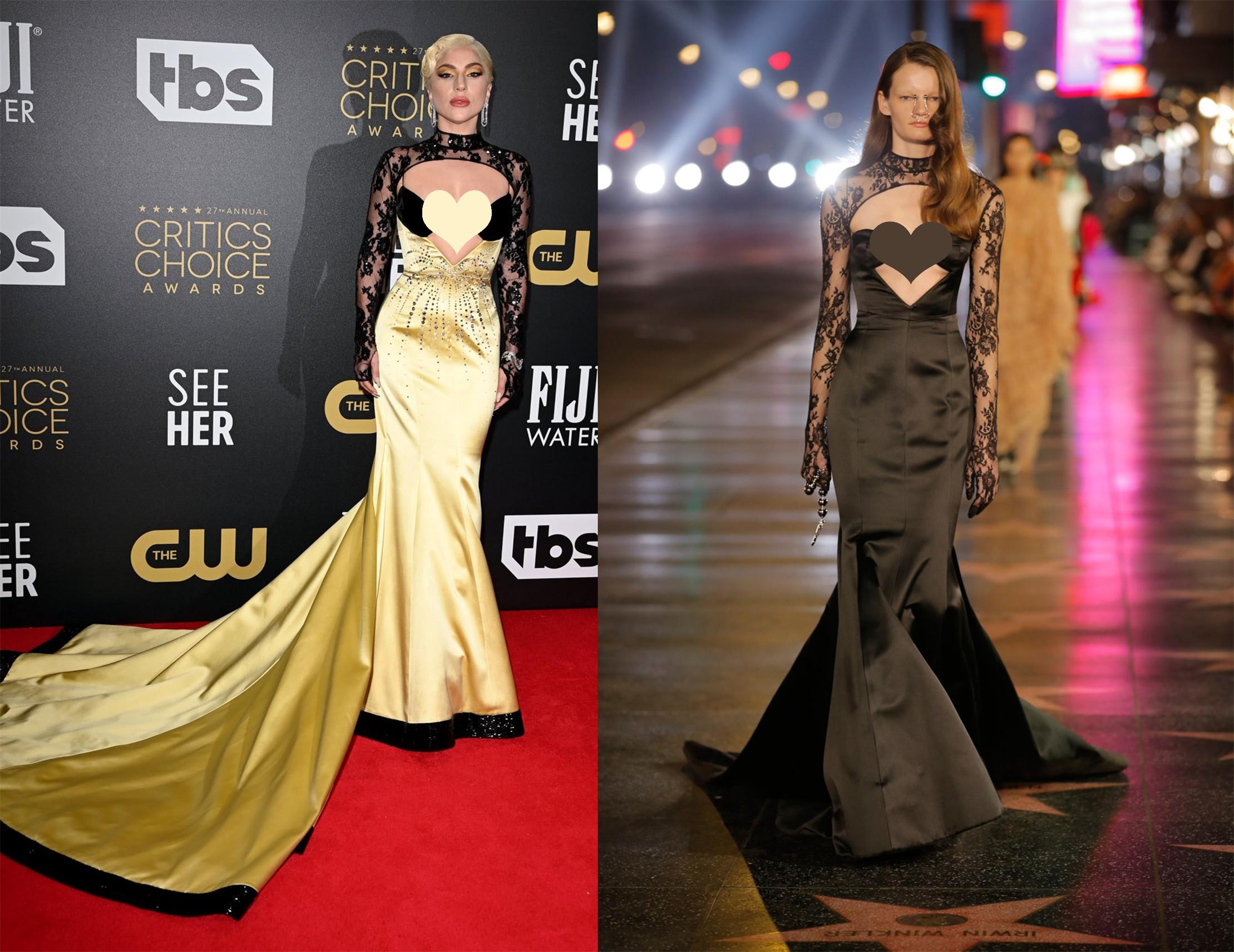 这次的两场红毯她都选择了拖尾的鱼尾礼服,一套来自Gucci 2022春夏系列的定制款,这款礼服大胆的胸前设计是gaga的风格。
