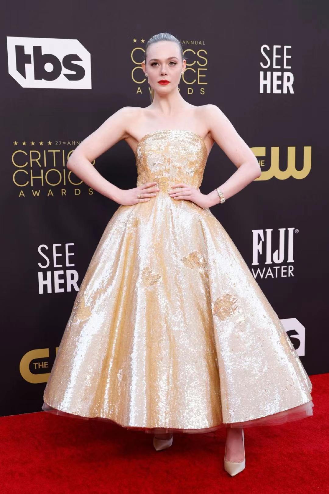 相比之下,elle fanning的Oscar de la renta定制要更闪耀,金色公主裙搭配明艳妆发和优雅的高跟鞋,妥妥的迪士尼公主。