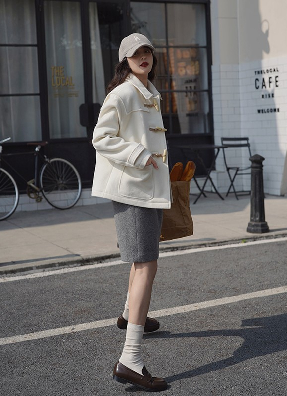 中长款的驼色大衣,也是经久不衰的一种色彩,完全吻合秋冬的氛围感。经典的牛角扣可以穿出重工的感觉,搭配清爽的小白裤,整体的造型搭配,偏向减龄,经典的学院风强调穿出少女感,走在大街上就像是艺术系的学姐一样。