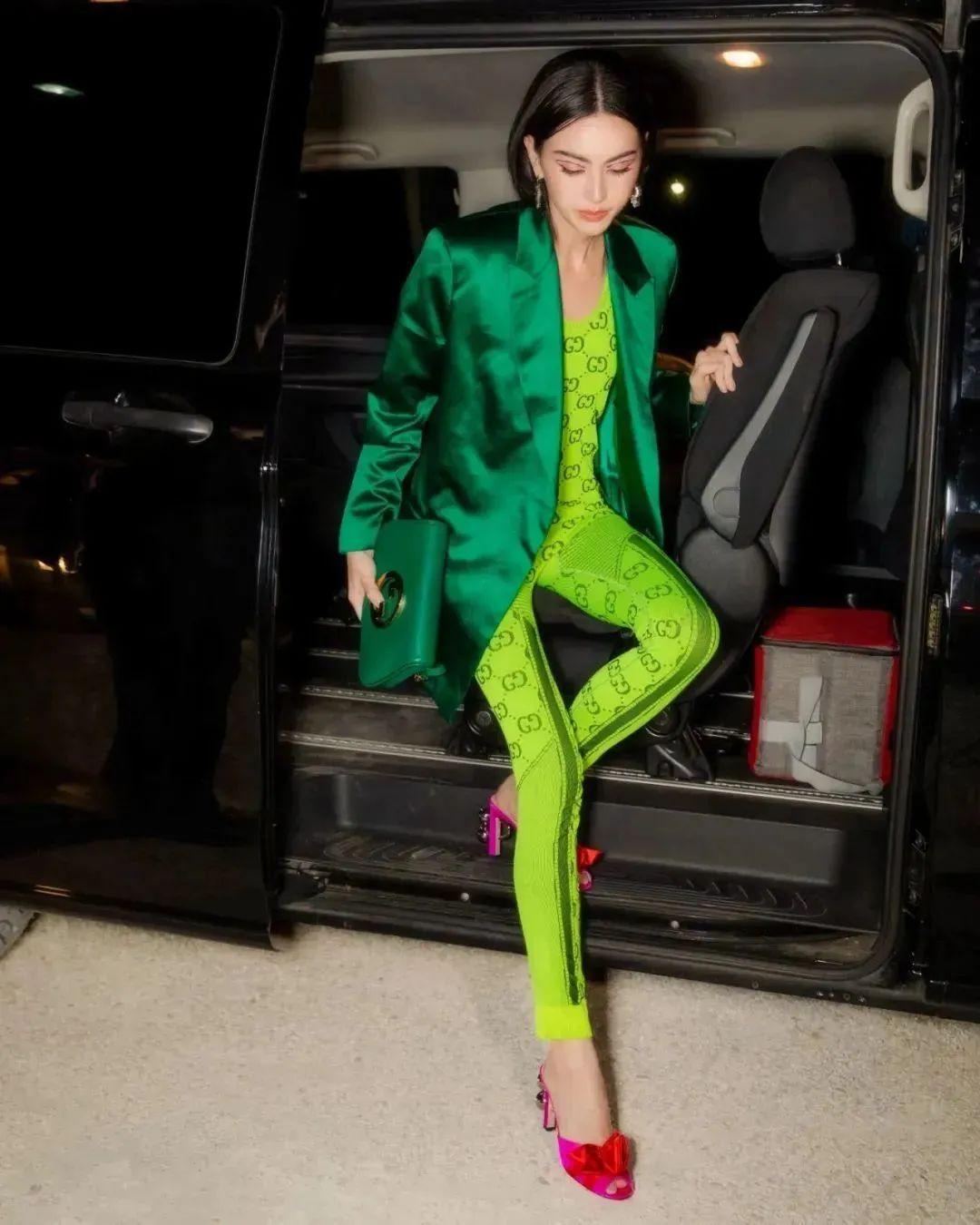 绿色也很容易流于艳俗,但Mai把简单的款型驾驭不错,夜幕下的埃菲尔铁塔前,闪烁的绿显得贵气又活泼▽