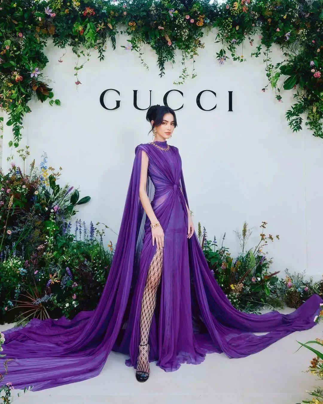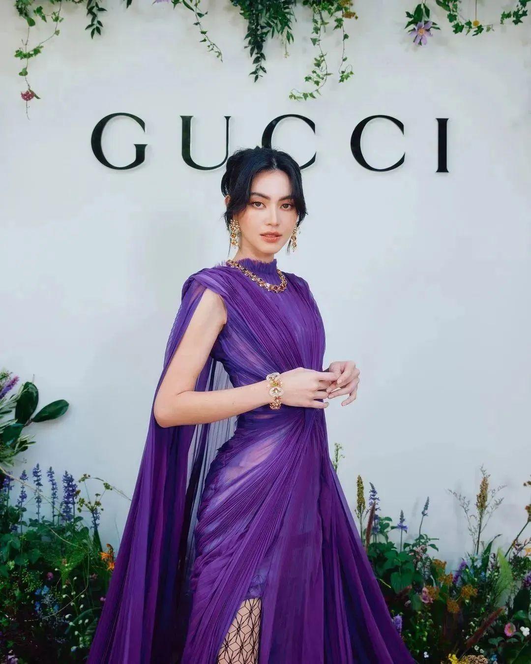 10月份,她身为GUCCI的亲女儿,身穿一套Gucci 2022早秋系列紫色连衣裙亮相曼谷Gucci高级珠宝活动。
