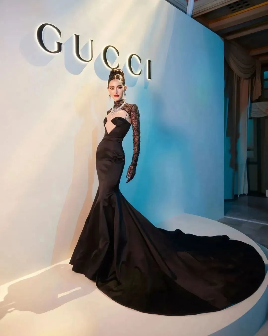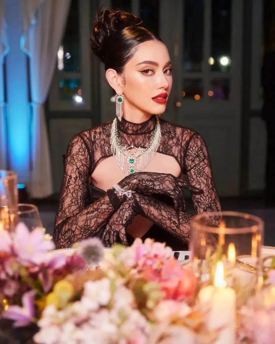 还是出席今年的GUCCI活动,Mai换了一身早秋款黑色镂空高定长裙,搭配 High jewelry。