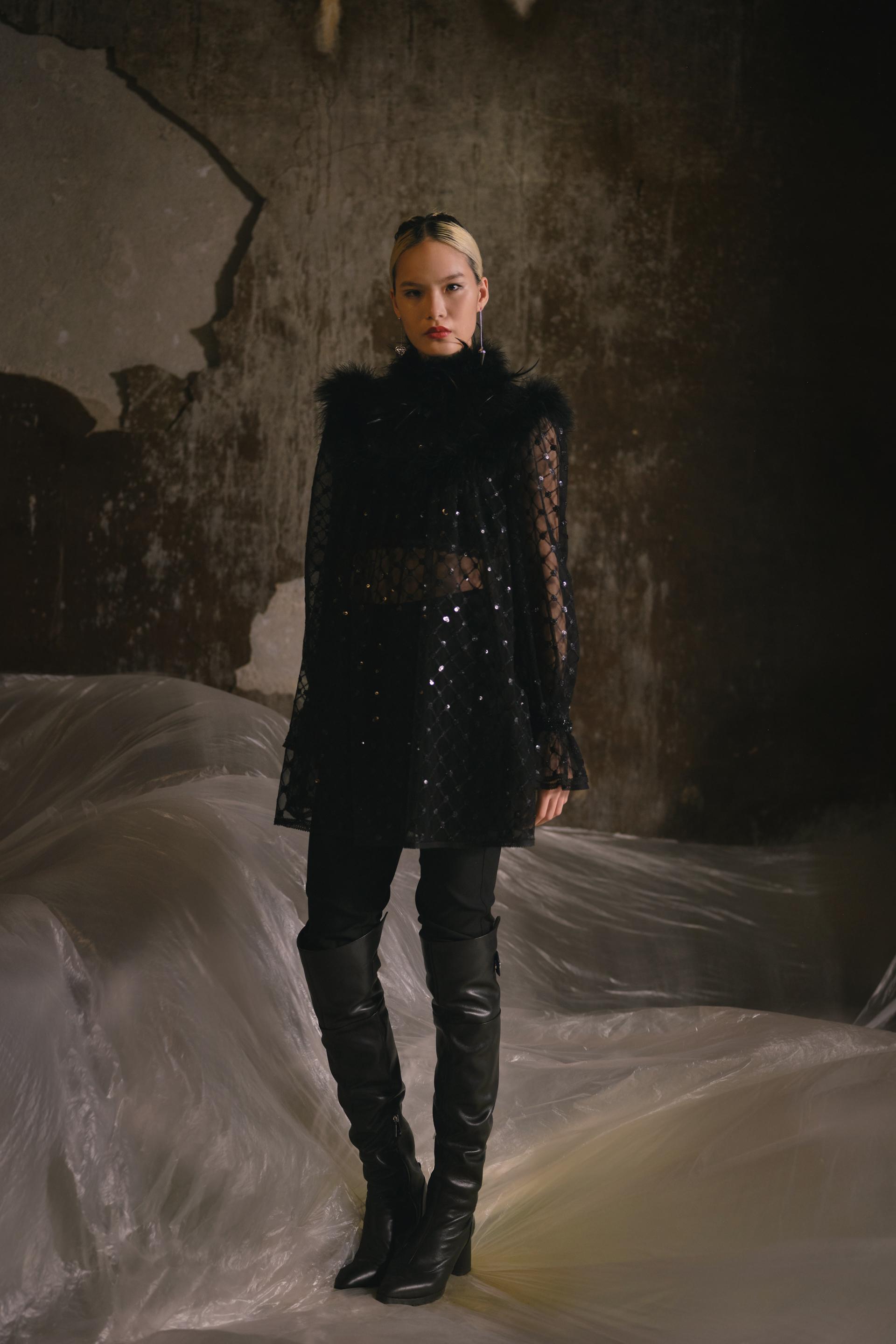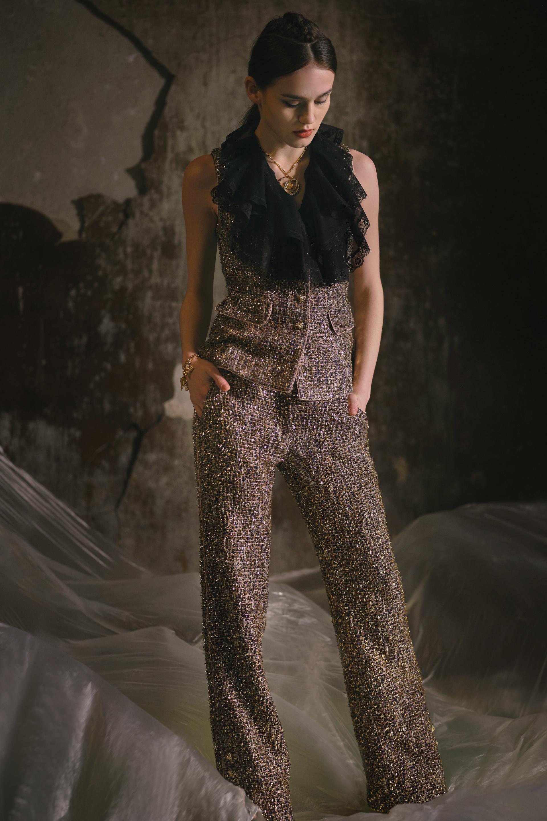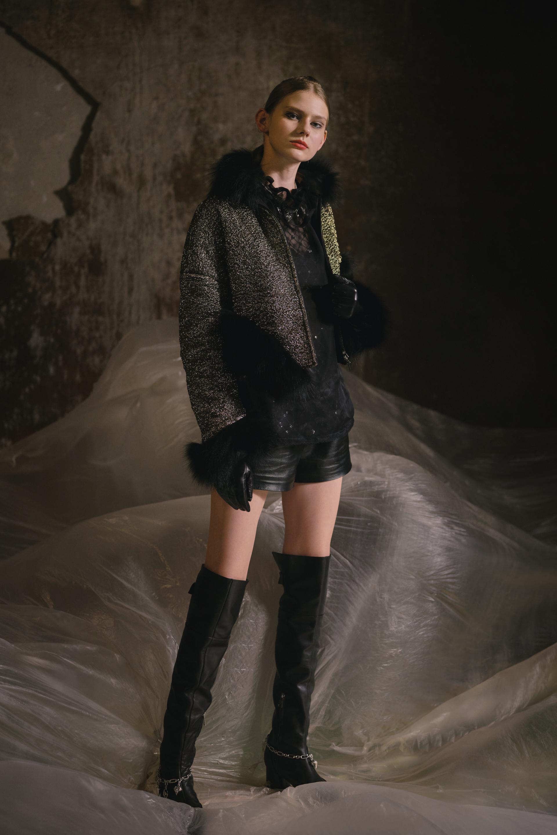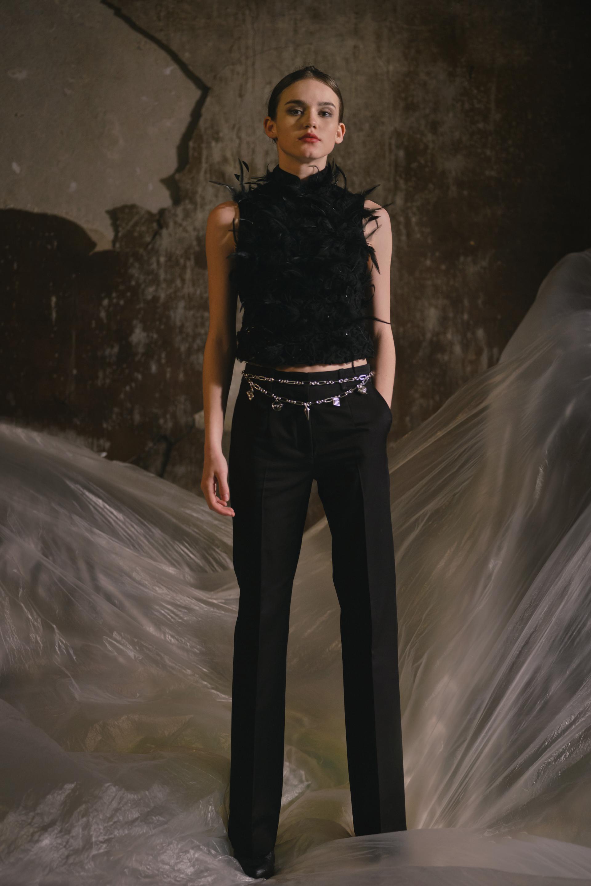 与之前的系列不同,本季我们看到更高比例的裤子和铅笔裙采用了简洁的中性风格。羊皮及膝长裤适合时髦的及膝长靴,可搭配男式衬衫、超大外套或长款连帽休闲上衣。蕾丝紧身胸衣搭配背心和带有刺绣的透明网纱上衣,搭配金属配件,如项链和腰链,展现出柔软而有力的女性印象。颜色系列以经典的黑白两件套开始,而超大的复古羊腿袖外套和翻领喇叭裤长外套则是陈标志性的红色。在中间徘徊,我们有动画的颜色,如温暖的棕色和皇家蓝色,与失去合适的短裤伸出腿的形状。后,以一系列黑色和金色条纹结尾,饰以羽毛和3D蕾丝,时髦的直裤或大胆的单肩夹克,以浪漫的女性轮廓描绘摇滚乐的酷炫轮廓。