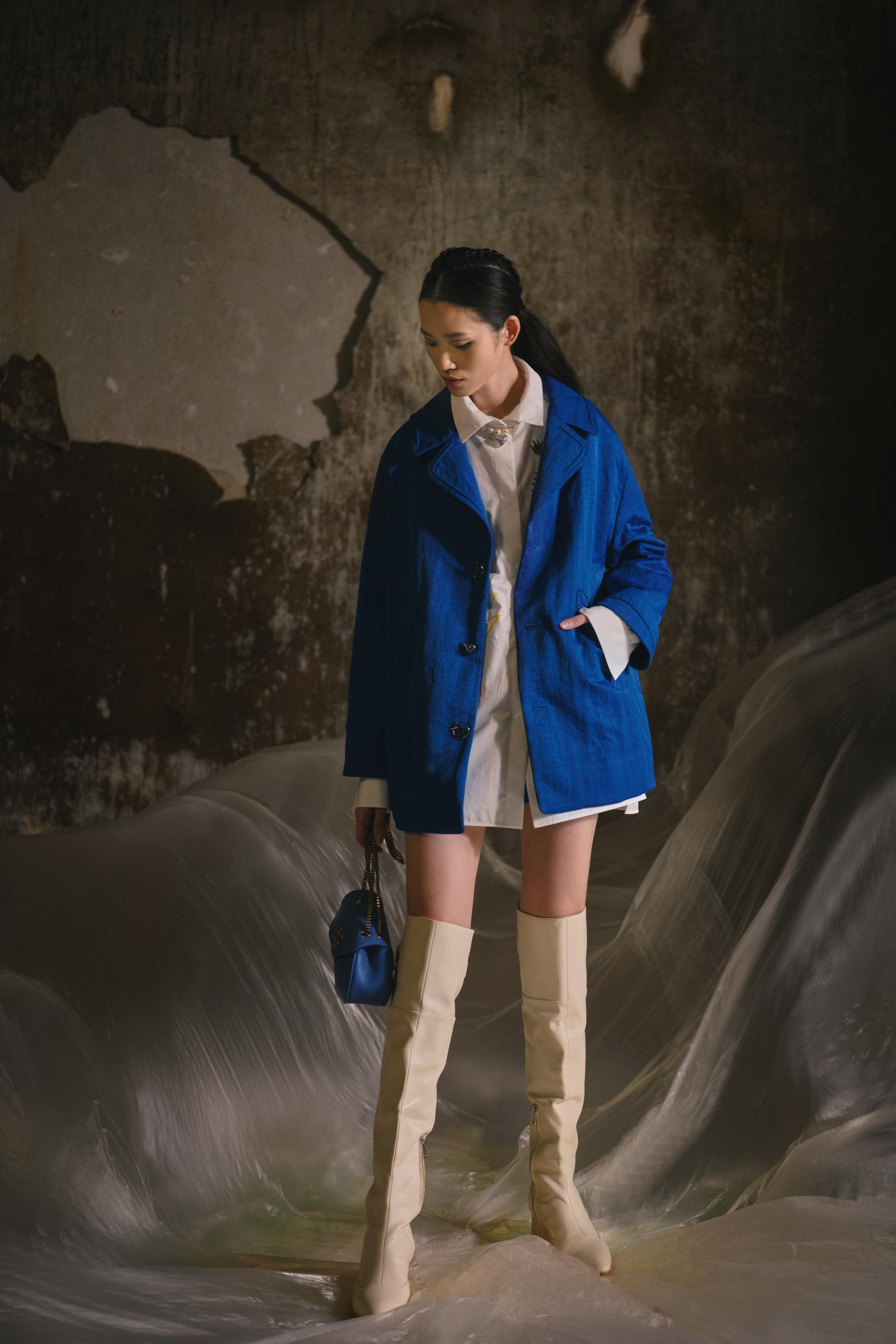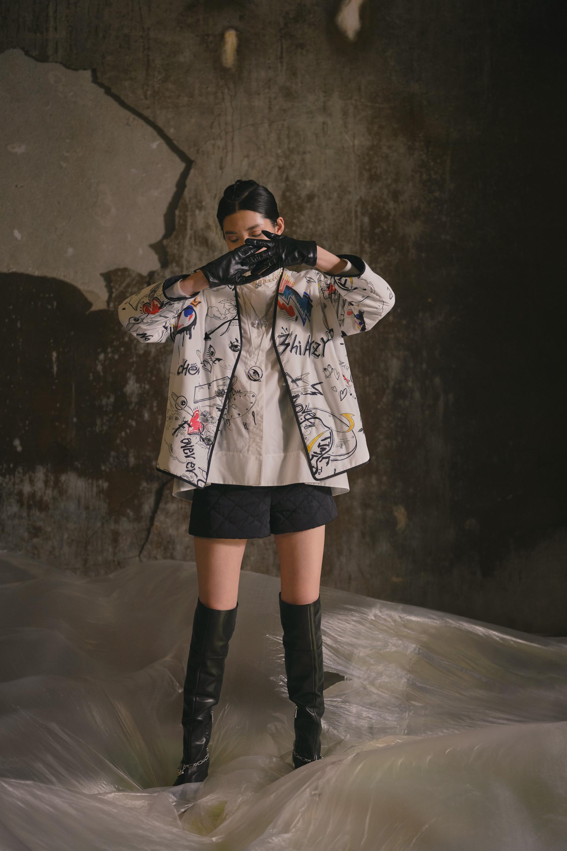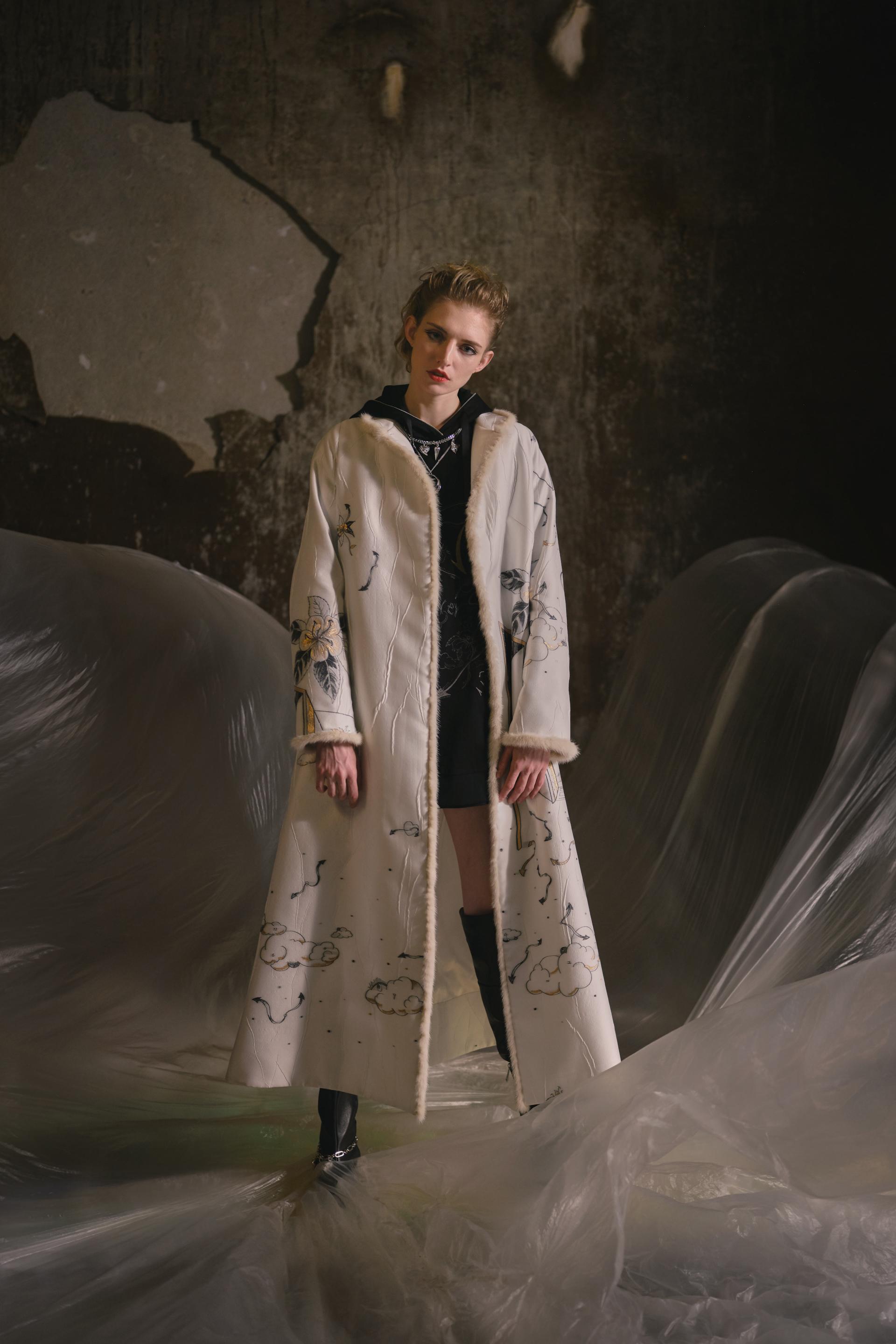 这个季节,我们看到优雅与叛逆交织在一起。伸展和中性的外观与褶皱布料的厚重感和强烈对比的颜色相匹配,展示了女性力量与衣服之间的联系,传递了超越时间和性别的信息。陈的反现实主义超现实主义原作以新旧交融为基础,以钟手、沙摆、圣人玫瑰等自由精神手绘为主题,被称为“钟花”。眼睛是进入灵魂和梦的窗口,以心灵的形状丰富多彩,而云、雷、门在时间中旅行,穿越时空。泛滥的符号在烧尽的印花、提花、手绘、刺绣中形成,编织出青春活力的图案。这些图案不仅存在于纺织品上,而且还作为配件出现,包括项链、不对称耳环、手镯和腰链。我们仍然尊重手工服装的品牌精神,打破传统的中国印象,用我们对现代东方的定义挑战现有的框架。