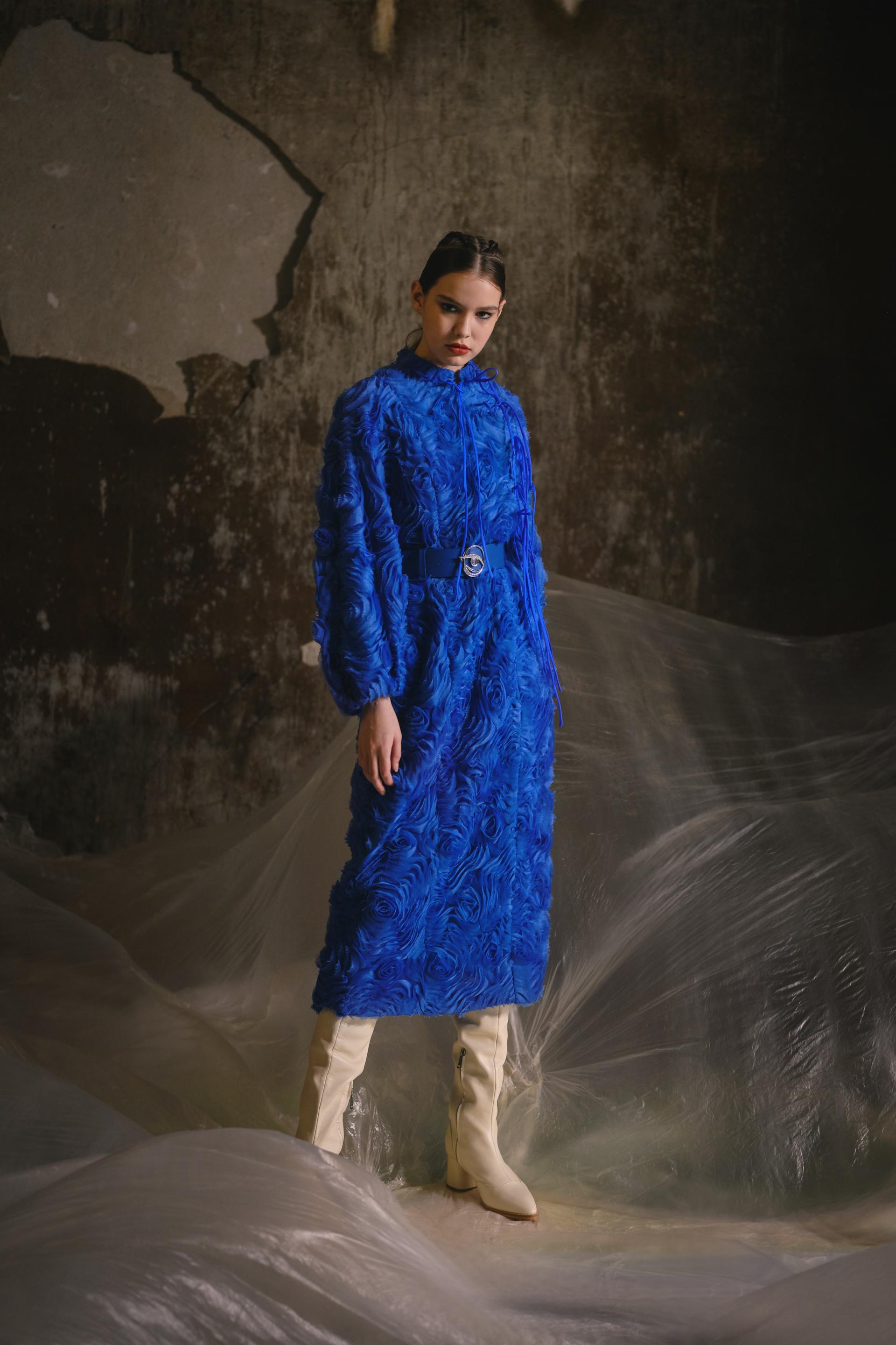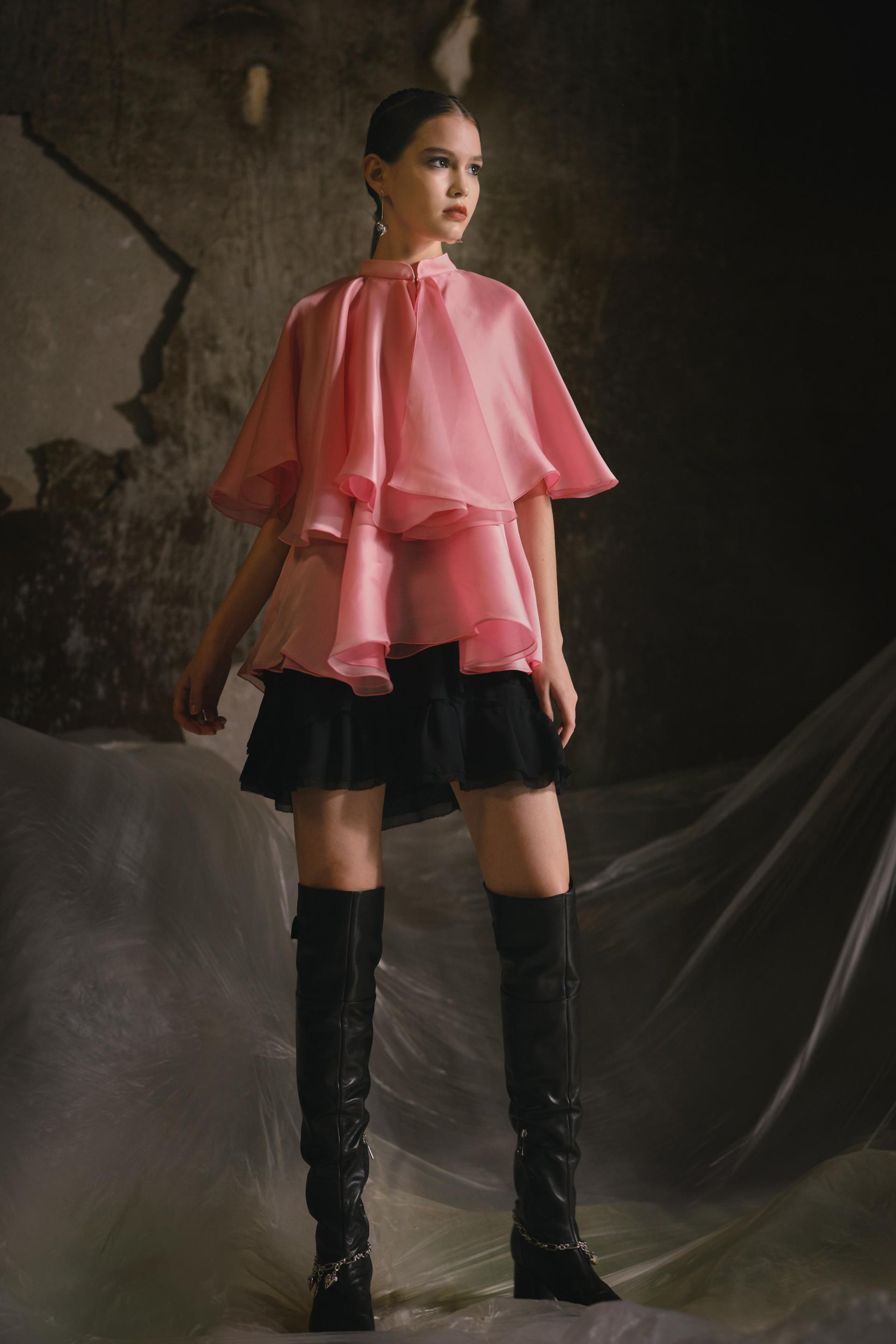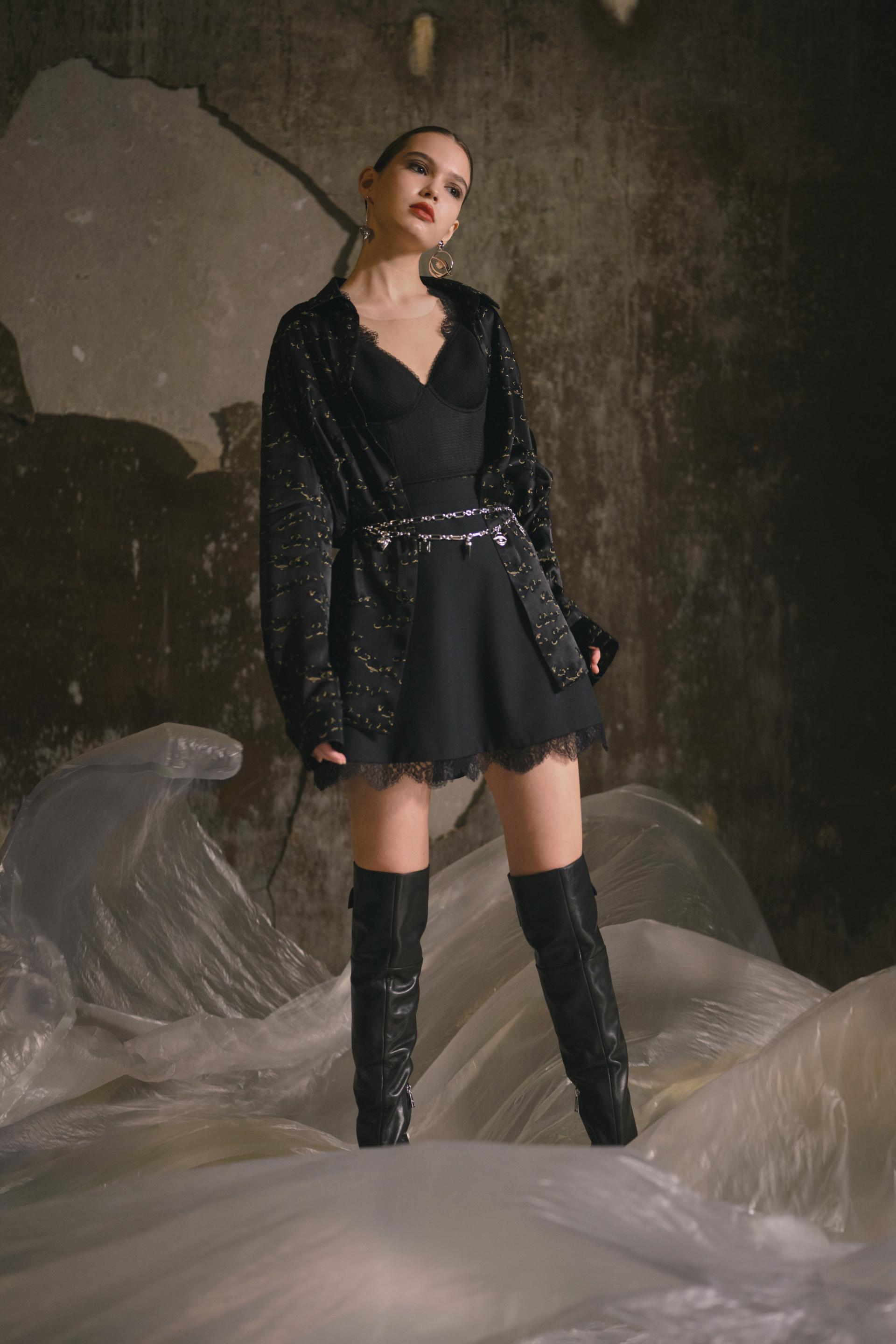 这个季节,我们看到优雅与叛逆交织在一起。伸展和中性的外观与褶皱布料的厚重感和强烈对比的颜色相匹配,展示了女性力量与衣服之间的联系,传递了超越时间和性别的信息。陈的反现实主义超现实主义原作以新旧交融为基础,以钟手、沙摆、圣人玫瑰等自由精神手绘为主题,被称为“钟花”。眼睛是进入灵魂和梦的窗口,以心灵的形状丰富多彩,而云、雷、门在时间中旅行,穿越时空。泛滥的符号在烧尽的印花、提花、手绘、刺绣中形成,编织出青春活力的图案。这些图案不仅存在于纺织品上,而且还作为配件出现,包括项链、不对称耳环、手镯和腰链。我们仍然尊重手工服装的品牌精神,打破传统的中国印象,用我们对现代东方的定义挑战现有的框架。