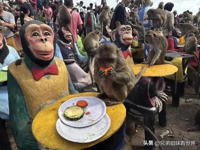 2022 年 11 月 27 日,在泰国华富里府的猴子盛宴上,猴子们正在享用水果。这个节日是华富里府一年一度的传统活动,旨在表达对猴子带来旅游业的感激之情。