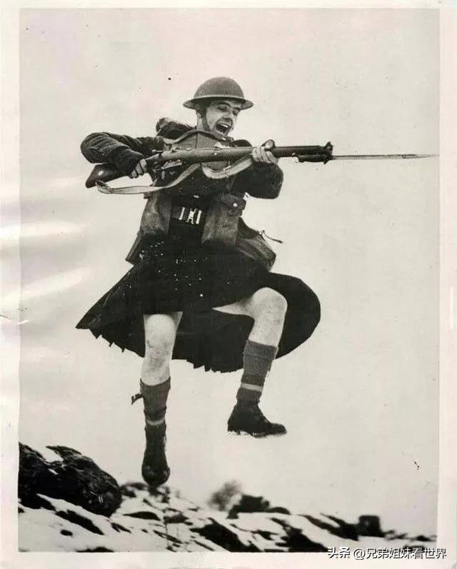 英国。1941 年,一名英国金马伦高地军士兵在接受刺刀训练。