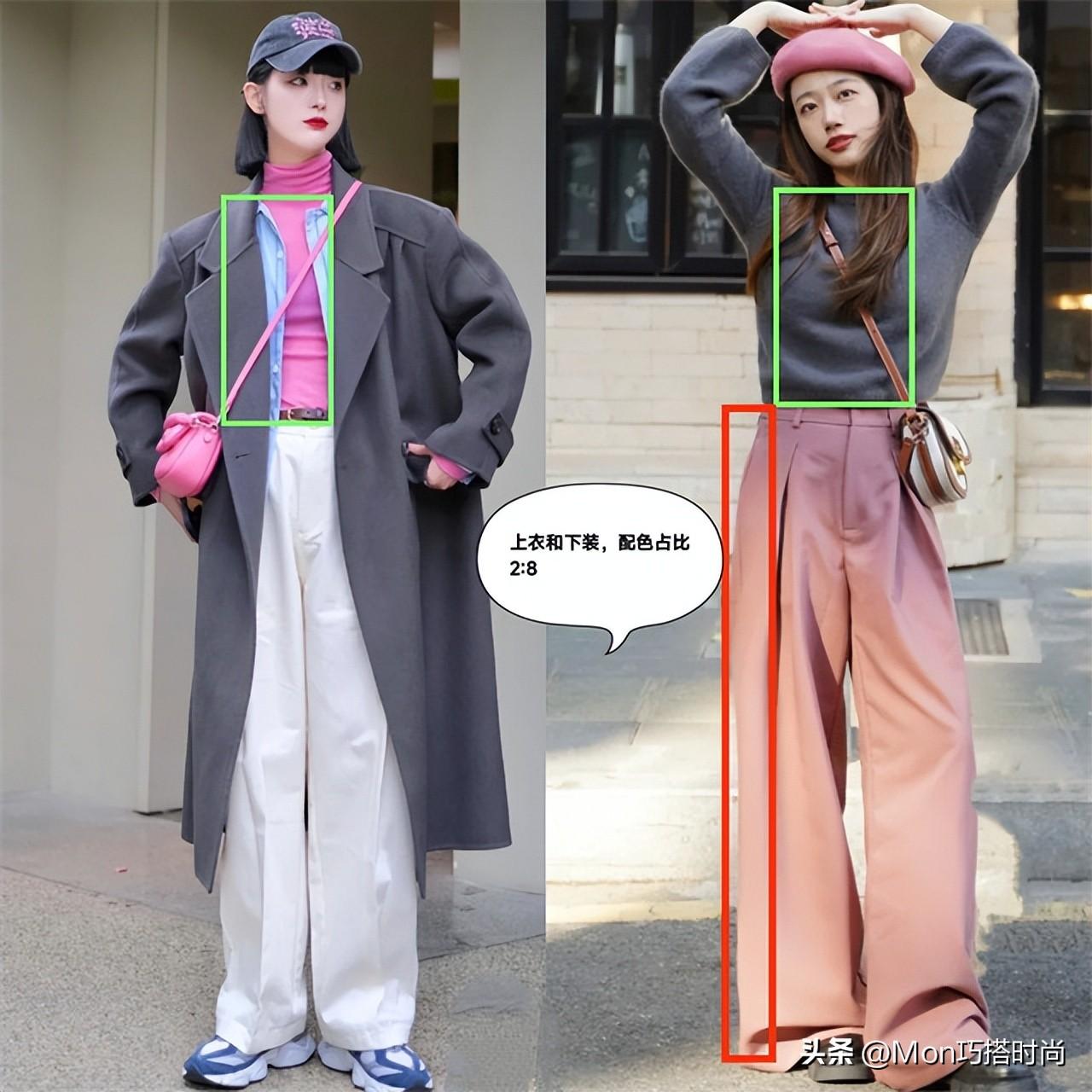 好在可以通过配色拯救。上衣和下装选择二八分配色比例,有的色彩对比更能突出长腿优势。粉色上衣+白色阔腿裤;灰色毛衣+粉色长裤,驾驭起来都太轻松。