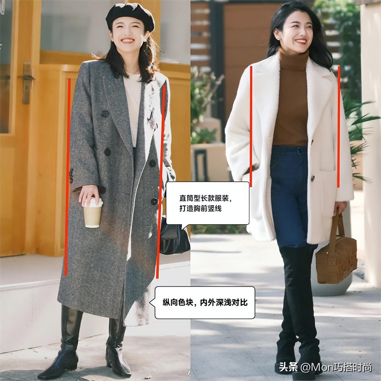 ②腰粗腿细的苹果型:长款服装+纵向色块显瘦