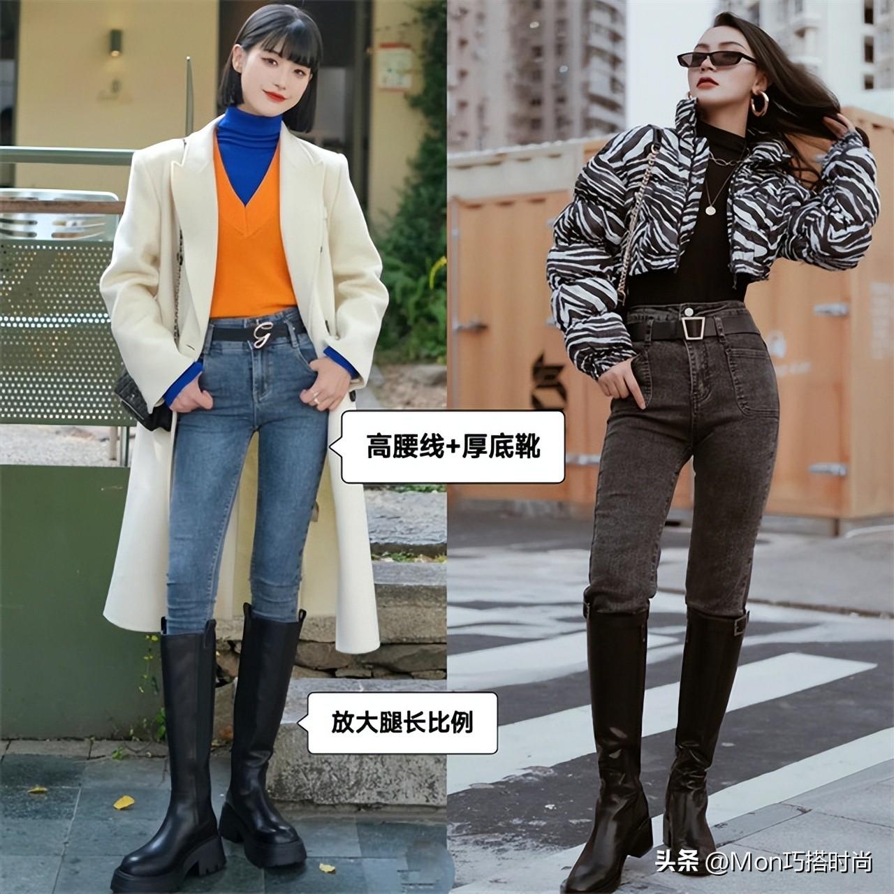 ①高腰线+厚底靴,放大腿部比例