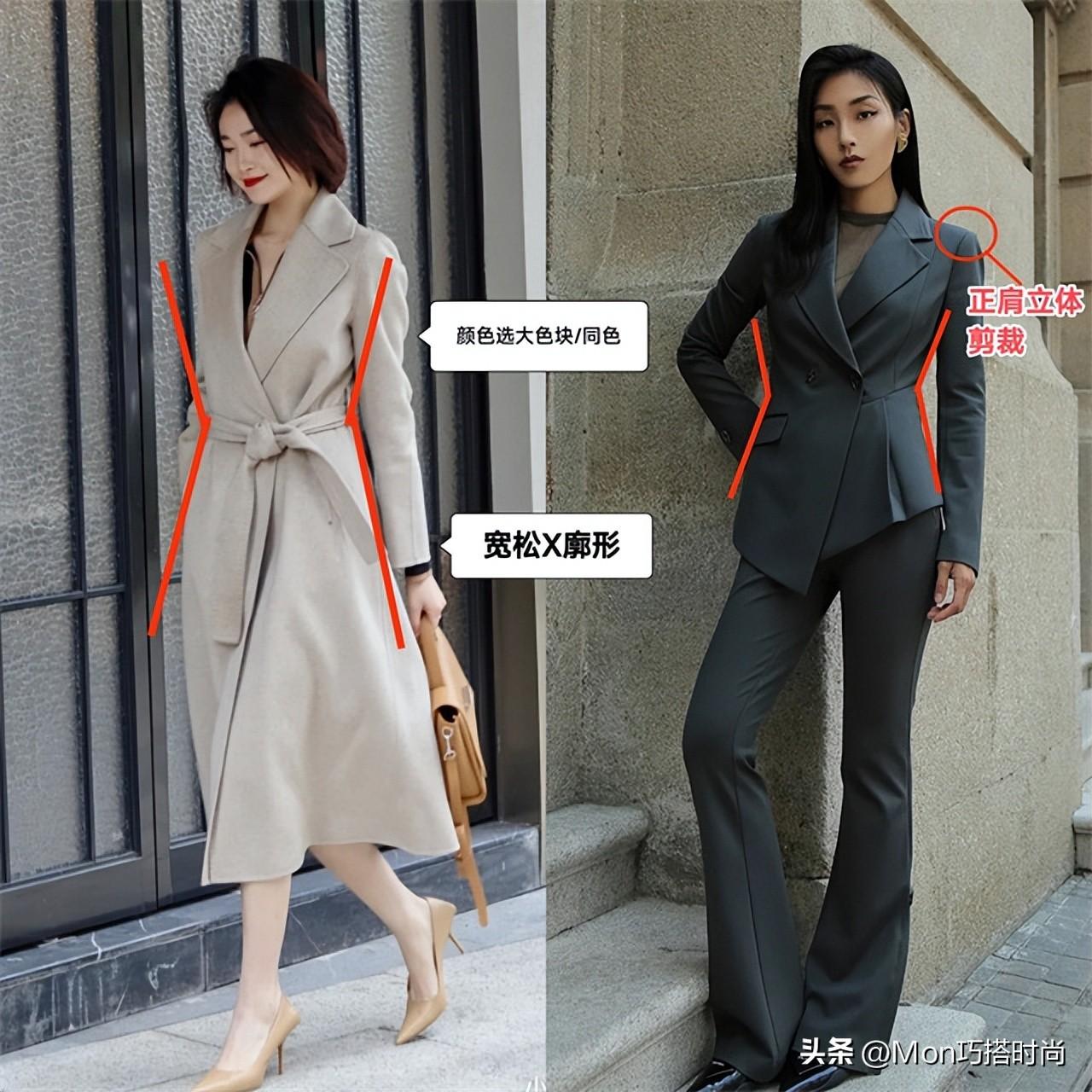 好的选择便是多穿宽松x廓型的服装。长款收腰大衣、不规则收腰西装,结合正肩剪裁,利落大色块,简直气场两米八!