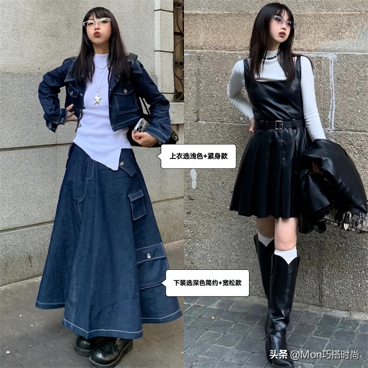 但选择宽松的半裙和外套将缺陷遮住,换成更时髦的紫黑配色,上短下长塑造比例,立刻就能化身为杂志封面级的存在,谁说穿搭不重要?