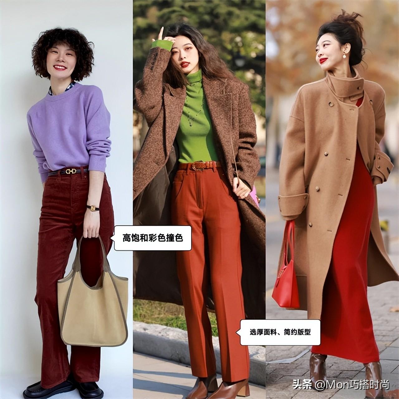 紫色毛衣配灯芯绒阔腿裤,充分诠释复古魅力。棕色大衣内搭红绿撞色,让人眼前一亮。咖啡色大衣叠穿红色长裙,更性感妖娆,身材一般也不耽误咱们大放异彩。