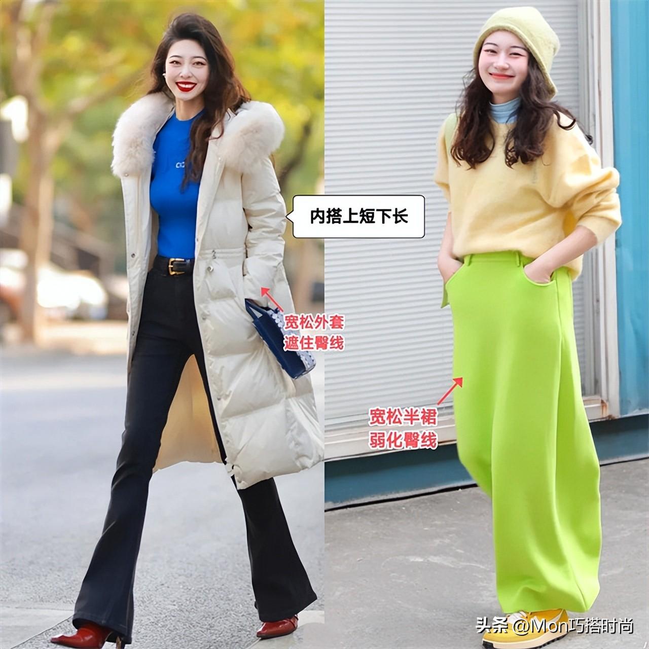 ②长短上:上短下长+宽松下装,弱化臀线位置