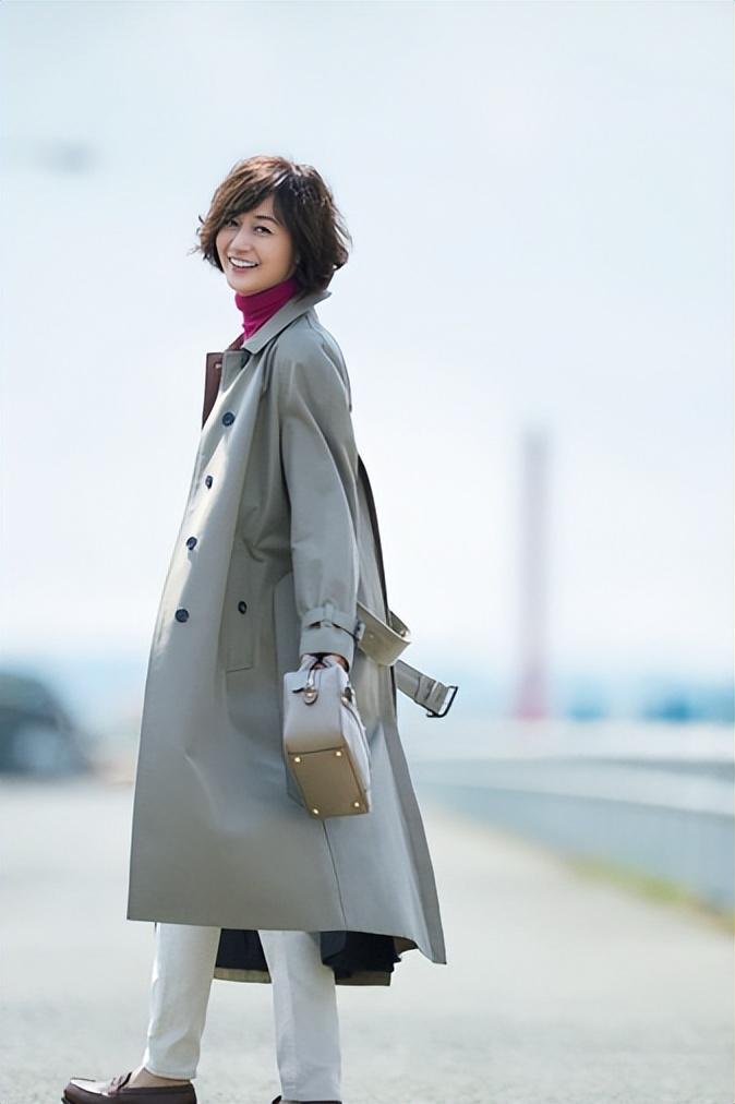 与低饱和度色彩相呼应,福冈佳子选择的服饰款式也大多是基本款。这件灰白色的大衣是经典的双排扣设计,外观简约利落,避开多余的装饰线条,简简单单的就很高级。
