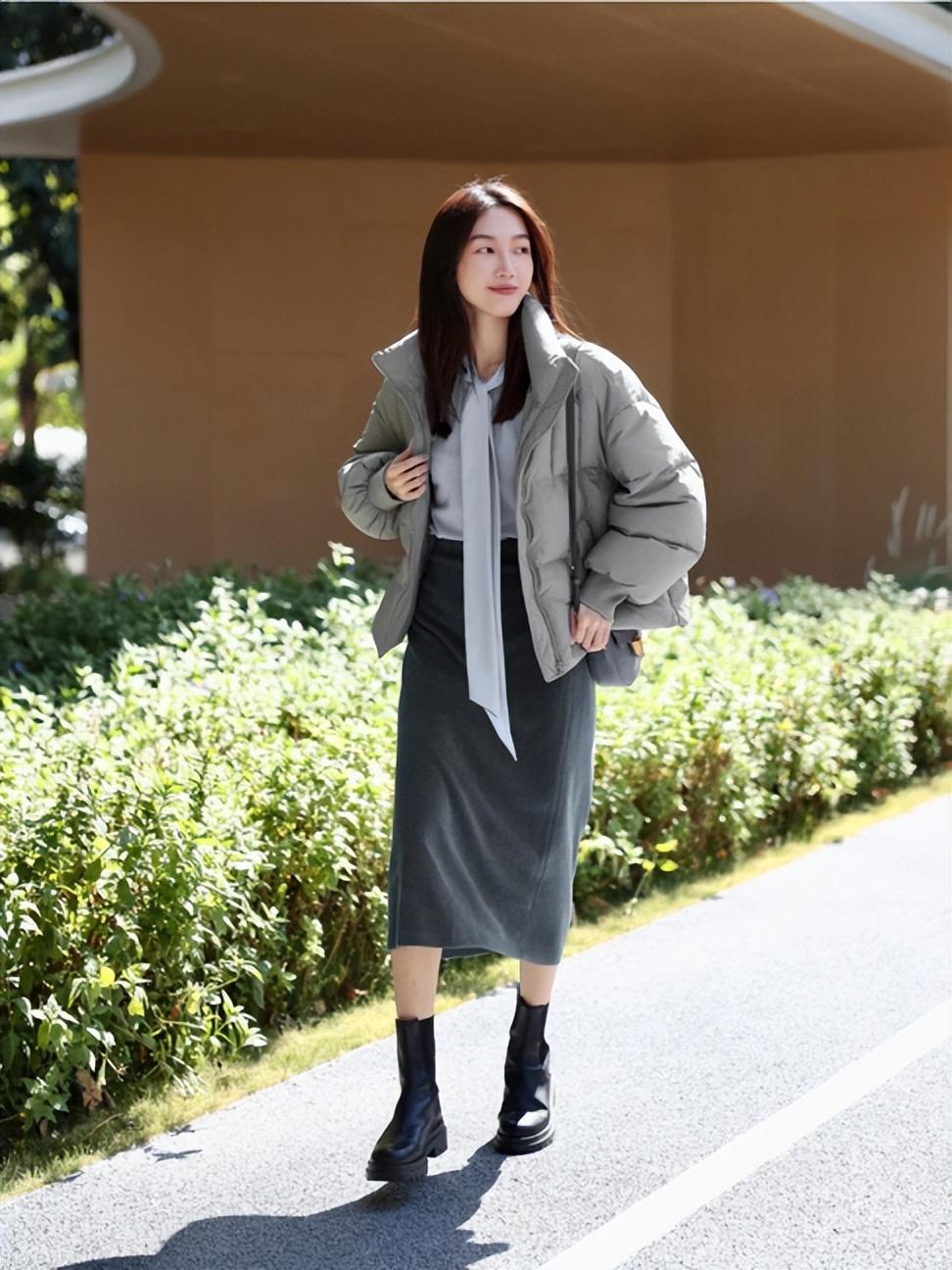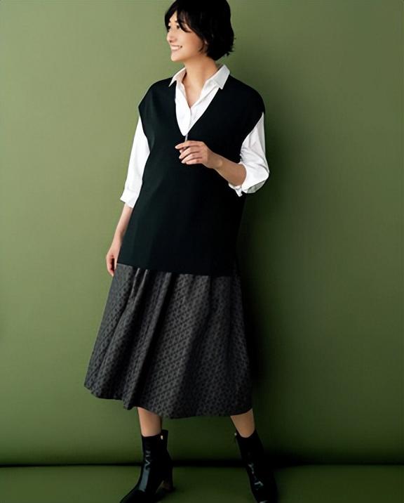 这种黑色的针织背心,正式的同时又带着一丝学院风。内搭一件白色衬衫,气质感拉满。选择一条黑色微褶半身裙,可以隐藏大腿的肉肉,后搭配一双短靴,不露声色地诠释着中年女性内敛高级的气度。而且黑白灰统称“基础色”,是服装搭配的时候基础且不会出错的颜色,随便组合都很高级。