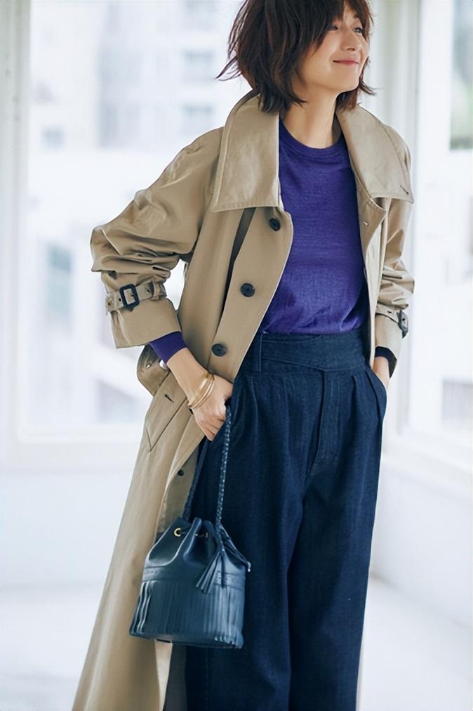她很多单品都是阔版的风衣。这套造型中,卡其色的风衣没有花里胡哨的剪裁,而是展露出它原始的质感,通过流畅的剪裁、品质感的面料,每让高级感自然而然就散发出来。内搭一件紫色T恤,然后穿一条阔腿裤,既遮肉又很有优雅的果。