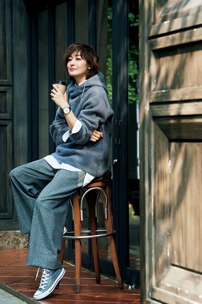 福冈佳子的穿搭里,基础款占了几乎80%,这么多的基础款中,大多数都是oversize的版型。你几乎从未看见过她穿着修身的单品。因为女人过了四十岁,不可避免的问题是新陈代谢降低所带来的身材走样。利用oversize的衣服来隐藏自己的身材缺点,是很聪明的做法。