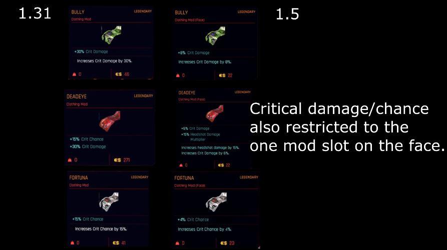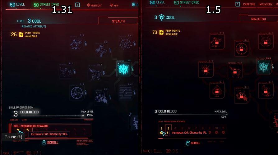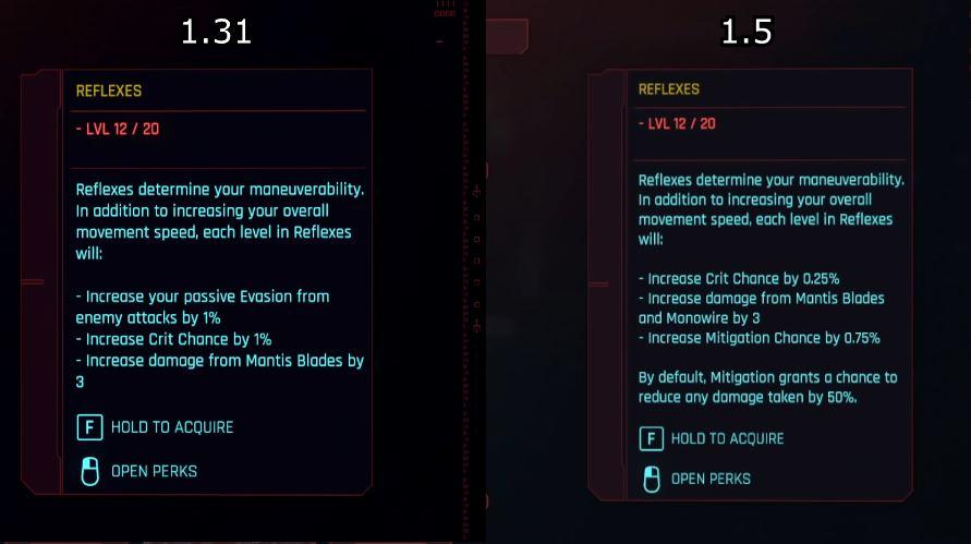 同时,原本角色的反应技能点每增加一点,就会增加 1% 的暴击率。1.5 更新后每个技能点仅增加 0.25% 暴击率。而冷血技能原本增加 10% 暴击率,现在也削弱为 1%。V 在一级时的默认暴击伤害也减半,从 减至 50%。