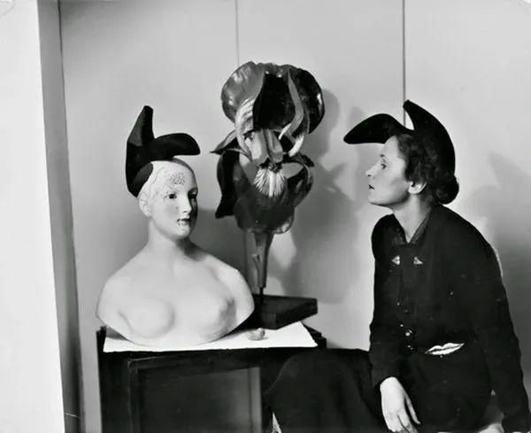 达利夫人佩戴由其丈夫和夏帕瑞丽共同设计的“倒扣高跟鞋”帽子