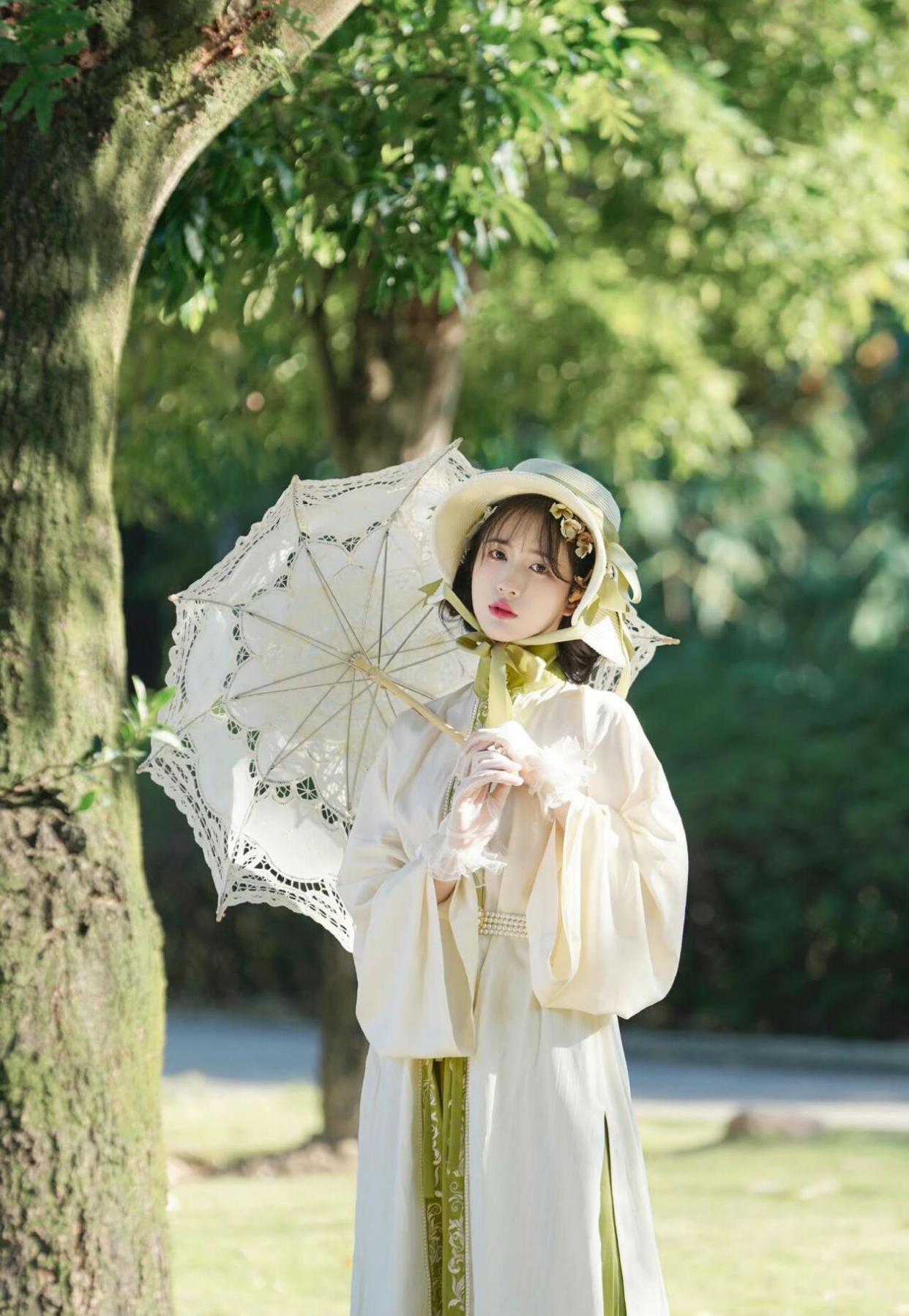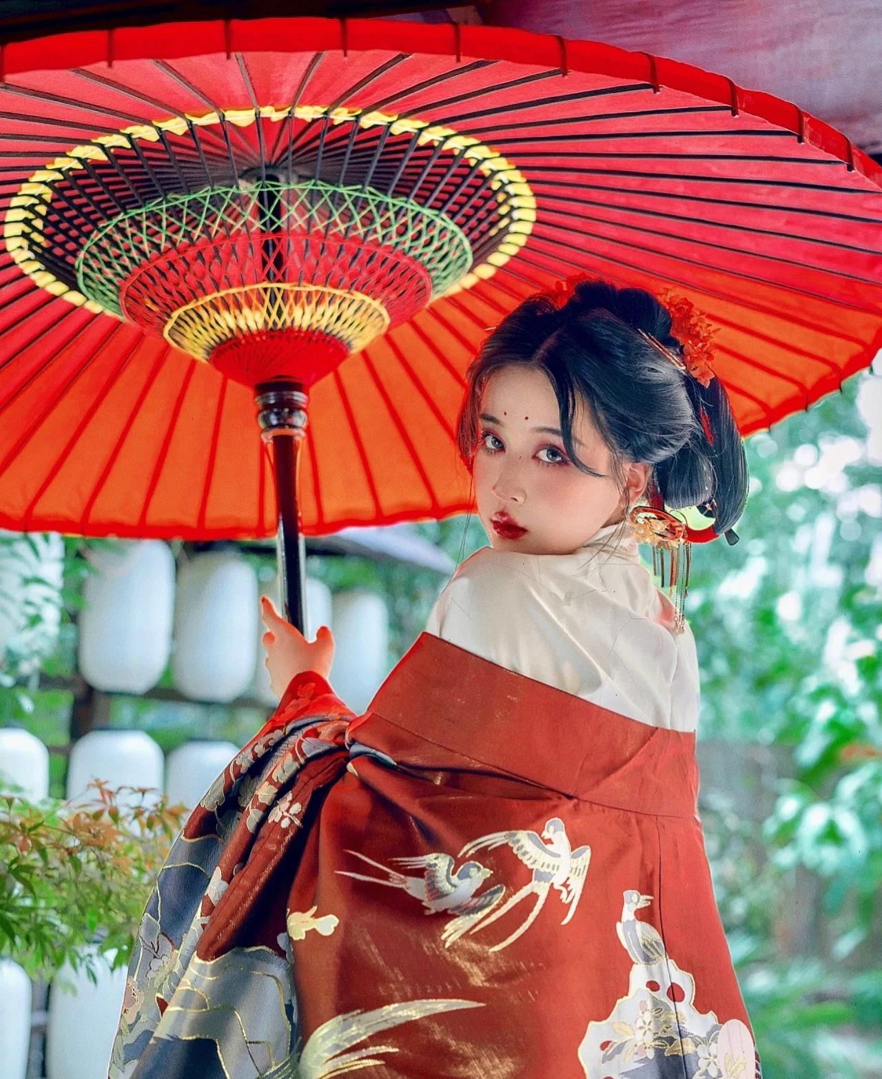 更值得注意的是,这套图的背景采用了榻榻米、野立伞、横纹白灯笼等众多日式风格十足的装饰物,加重了这套“汉服”的“和风味”。