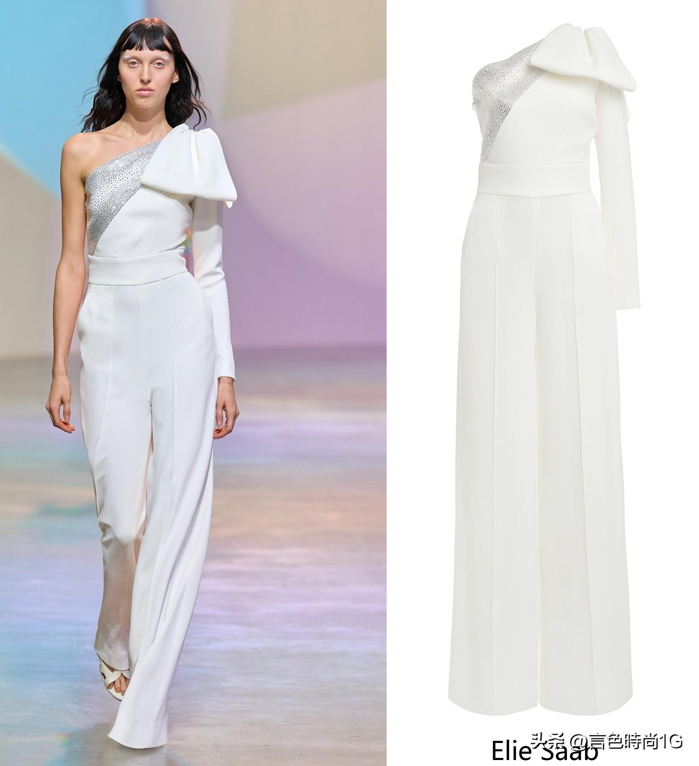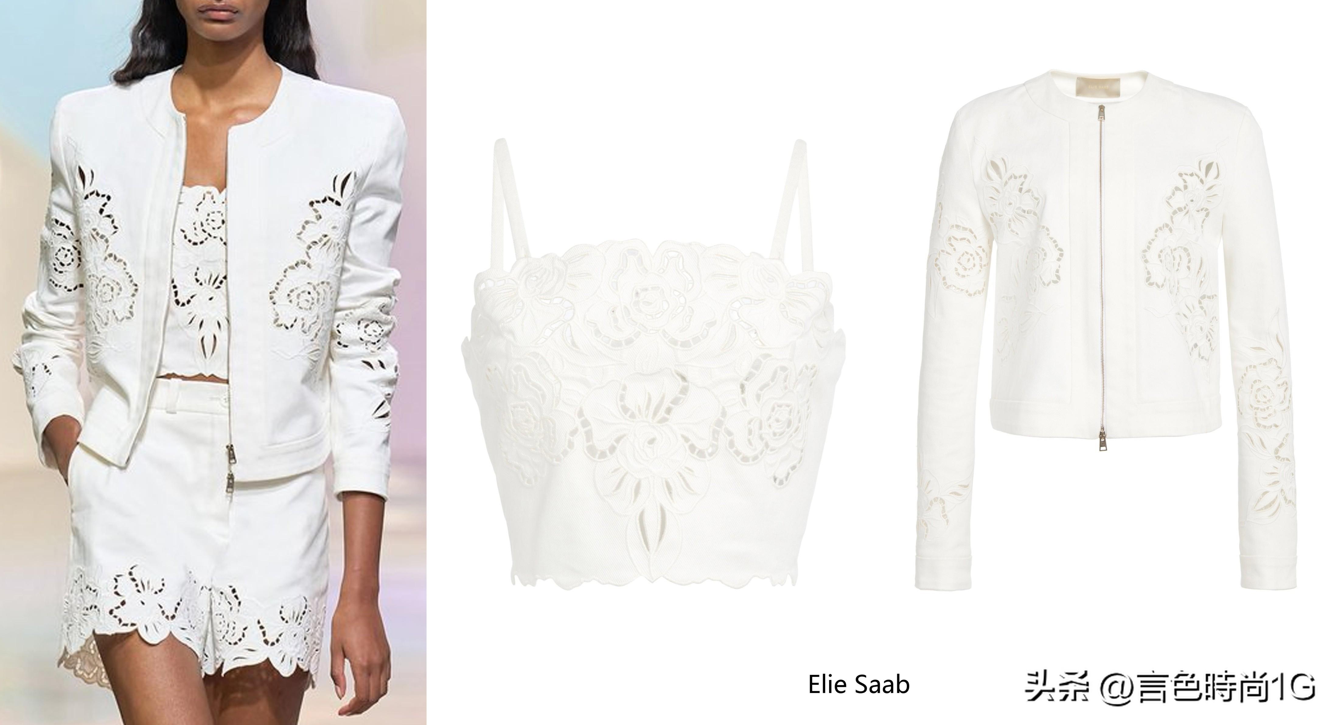 局部的烫钻则可以通过衣身版型做进一步修饰,闪耀亮眼的装饰果将人们的视线得以集中汇于某一细节处,即使是白色显胖的常规性视错果也得以忽略。