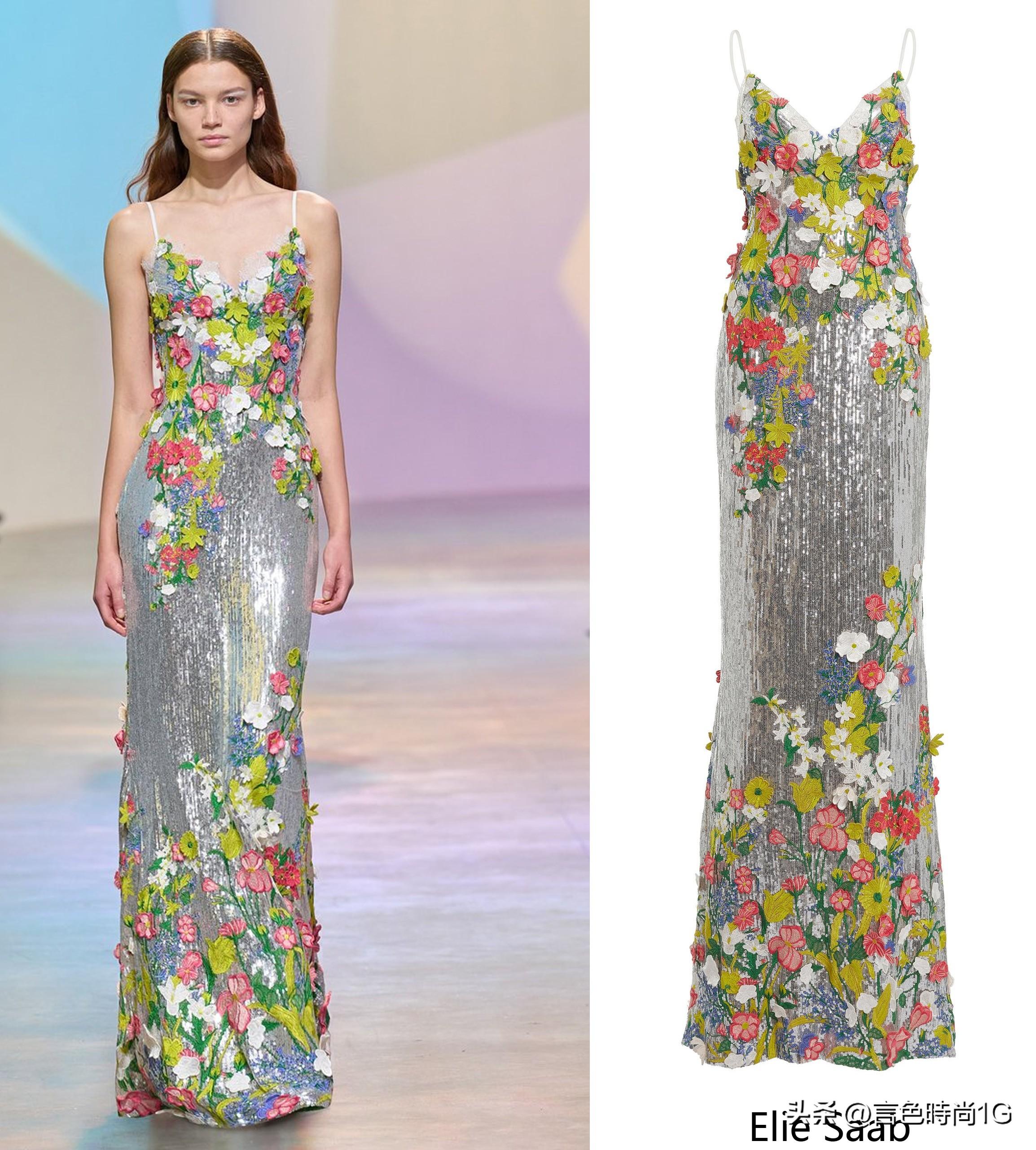 Elie Saab服装中的花卉不止是单纯的线绣,还包含玲珑珠片绣,就连边饰细节都选用烫钻与钉珠做饱满点缀,如此饱含匠人深情的工艺作品,带给人的除了生动形象的唯美造型,还有高雅考究的穿着感受,并唤起内心的喜悦之情。