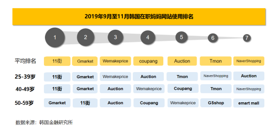 据悉,近日韩国金融经营研究所发布了《2019年韩国职场妈妈报告》。报告显示,广受韩国职场妈妈欢迎的网上购物平台是11街,紧随其后的电商平台是Gmarket、Coupang。Auction在职场妈妈中的受欢迎程度仅排第5,但在40岁至50岁的人群中却排到了第3位。