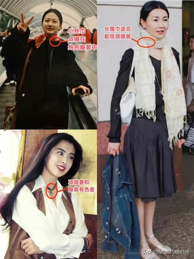 纯色服装就用彩色小丝巾点缀;服装领口太低,就搭一条围巾;基础款服装就配有色差的项链,一秒就能变精致贵气。