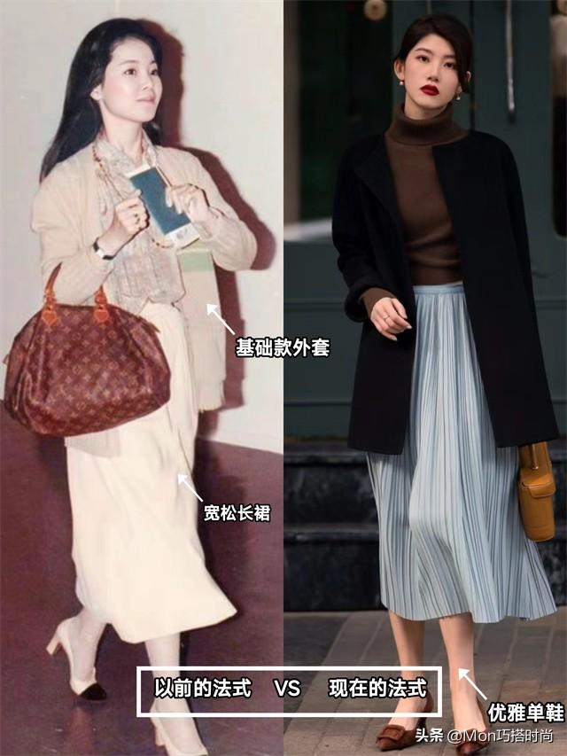 要拿捏这种浪漫又简约的法式风情,基础款外套+宽松长裙+一双优雅单鞋就能搞定,完全不过时。