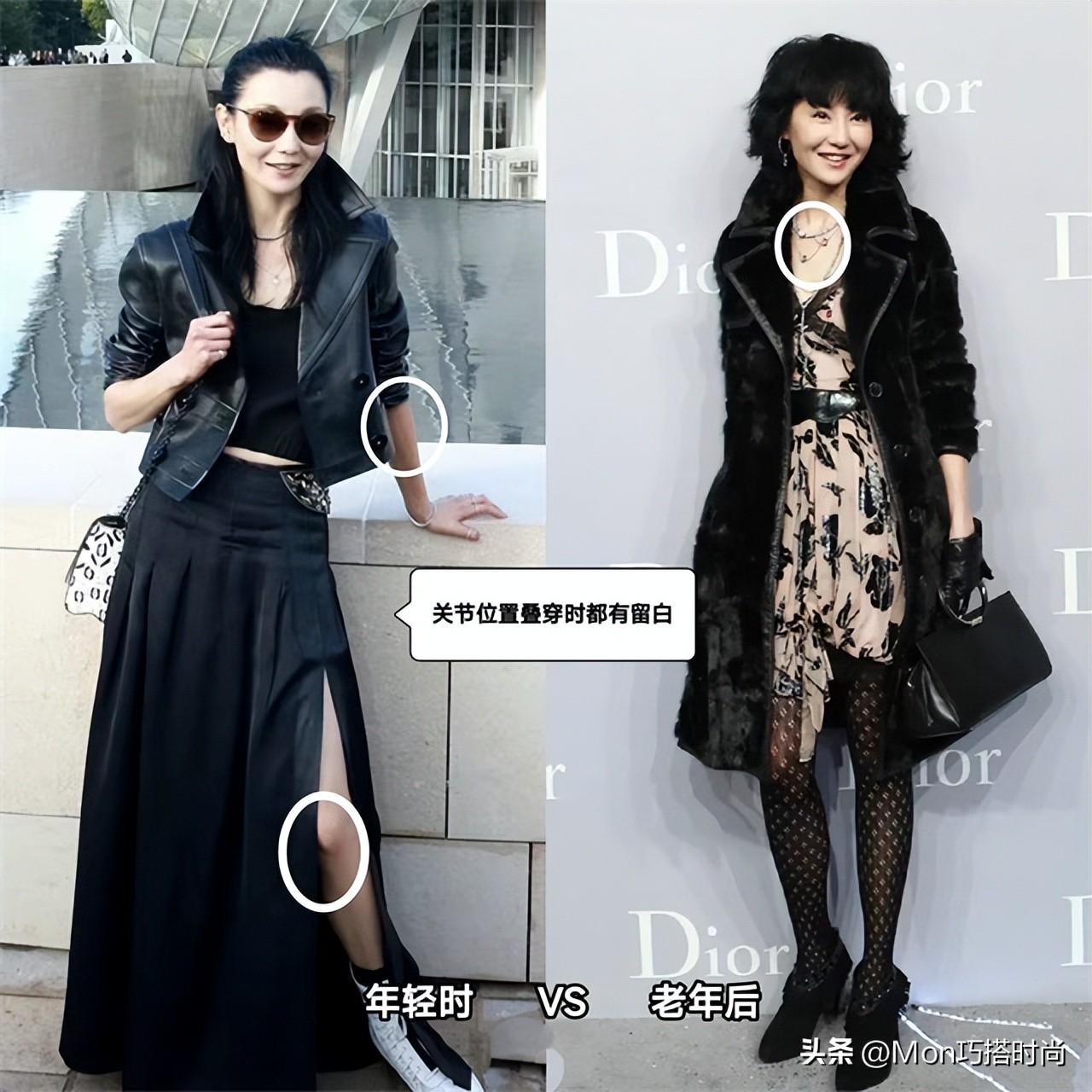 张曼玉也是叠穿的爱好者,年轻时用皮衣叠穿西装裙时就爱露出锁骨、手腕增加清爽感。老年后,穿皮草叠穿碎花裙、黑丝时,也同样采用了在锁骨、手腕处的留白穿法,让美丽永不落幕!