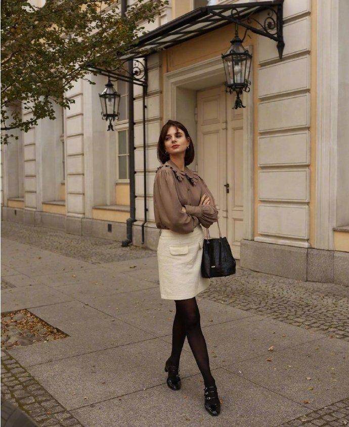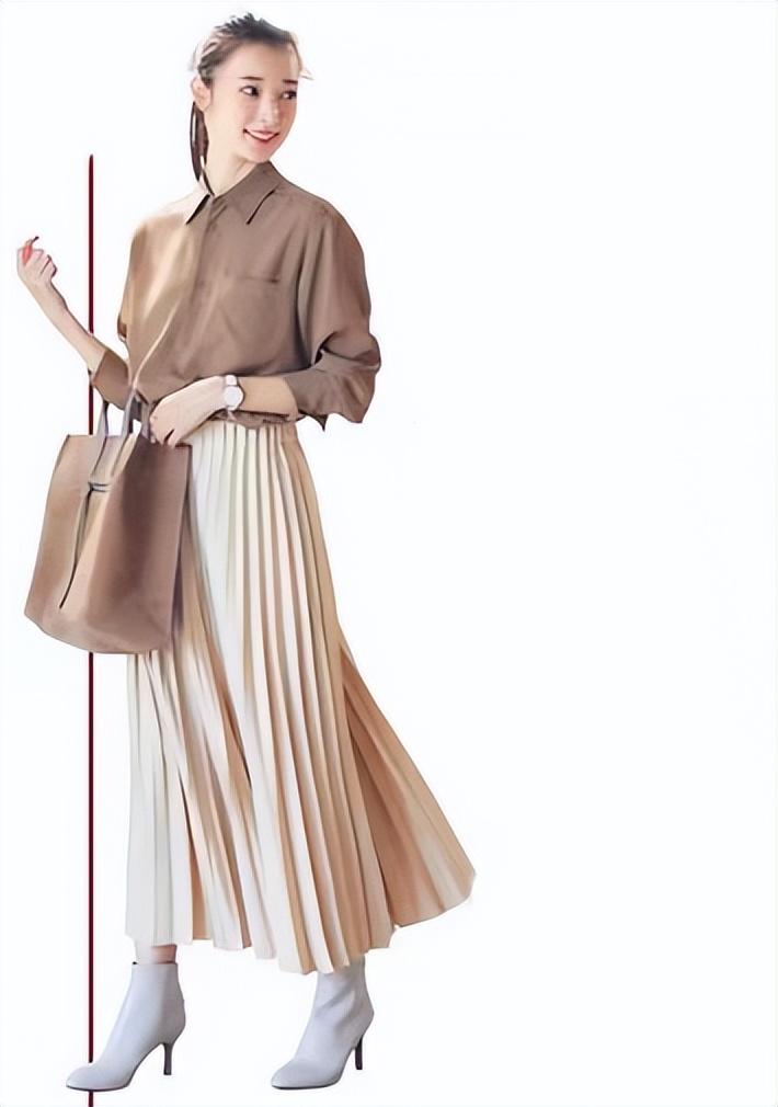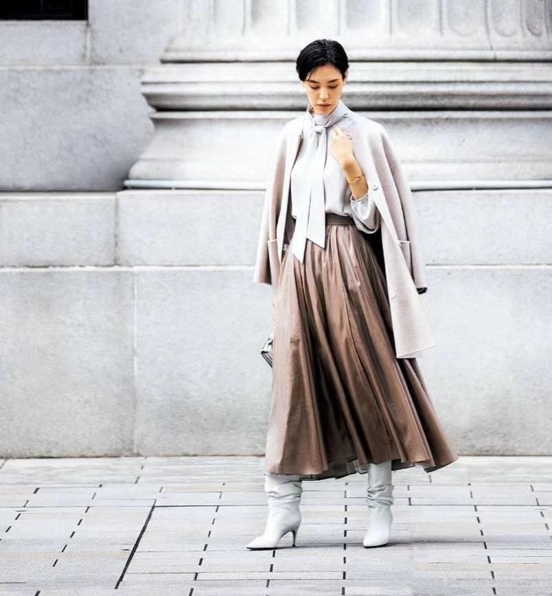 像这条米色百褶裙,褶片线条利落不僵硬,面料不软不硬,甩动之间动感特别迷人。搭配棕色衬衫,配一双白色短靴,优雅有型。
