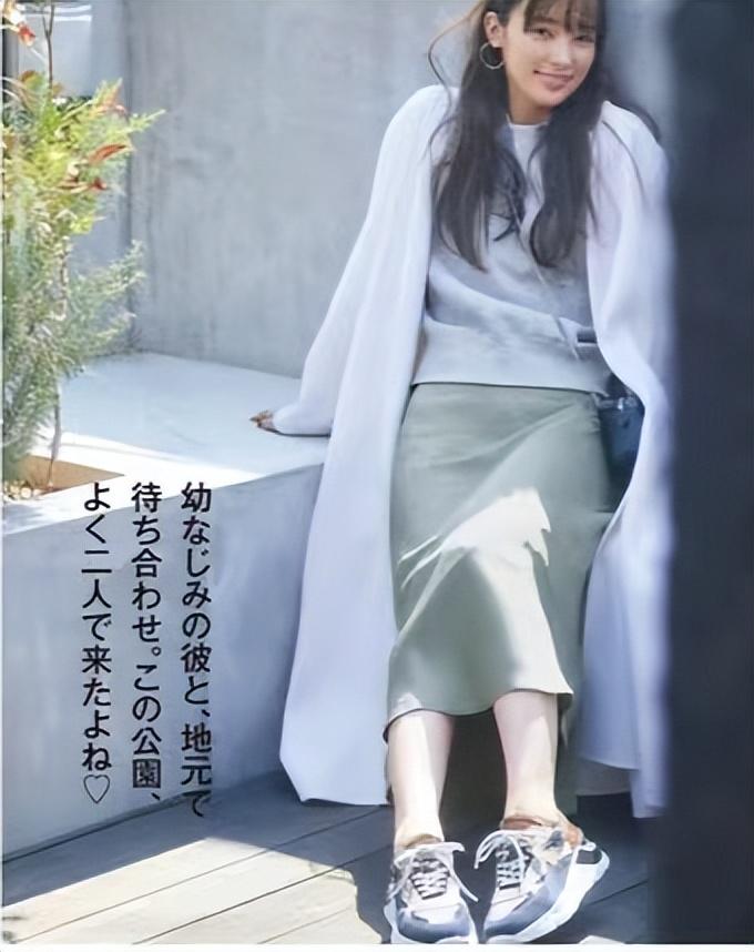 白色大衣、灰色卫衣、灰蓝色半裙,老实说这套搭配谈不上精彩。内浊外浅,本来挺干净的白色,也显得灰浊起来。