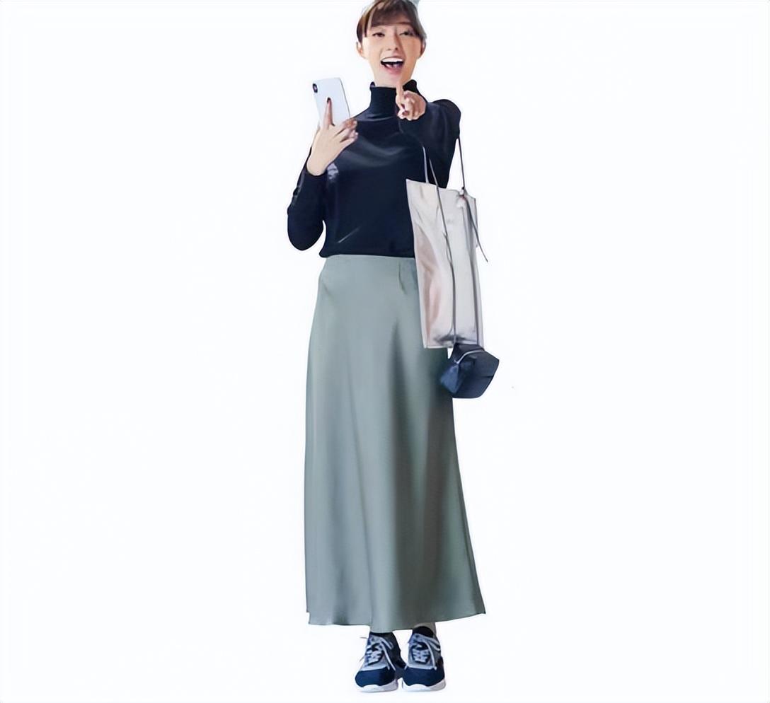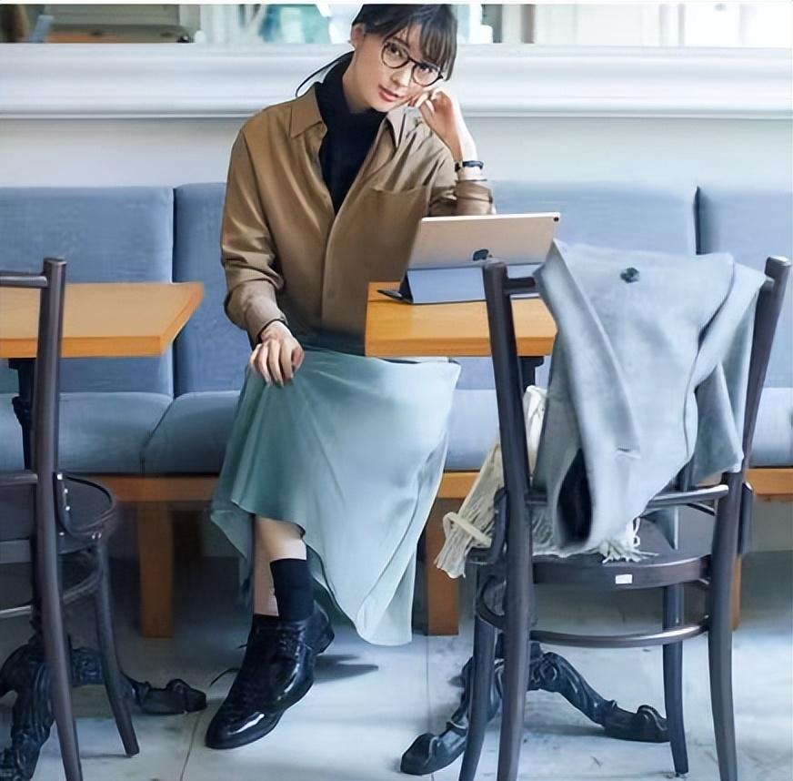 搭配灰蓝色半裙,写满高级感。黑色鞋袜呼应,重心沉稳,大气讲究。