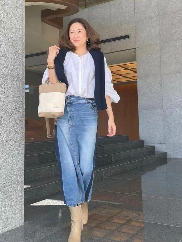这套牛仔风格的酷帅搭配当中,利用棕色长款无袖衬衫配上白色阔腿裤,显现出了中年女性身上的摩登感,让人刮目相看。
